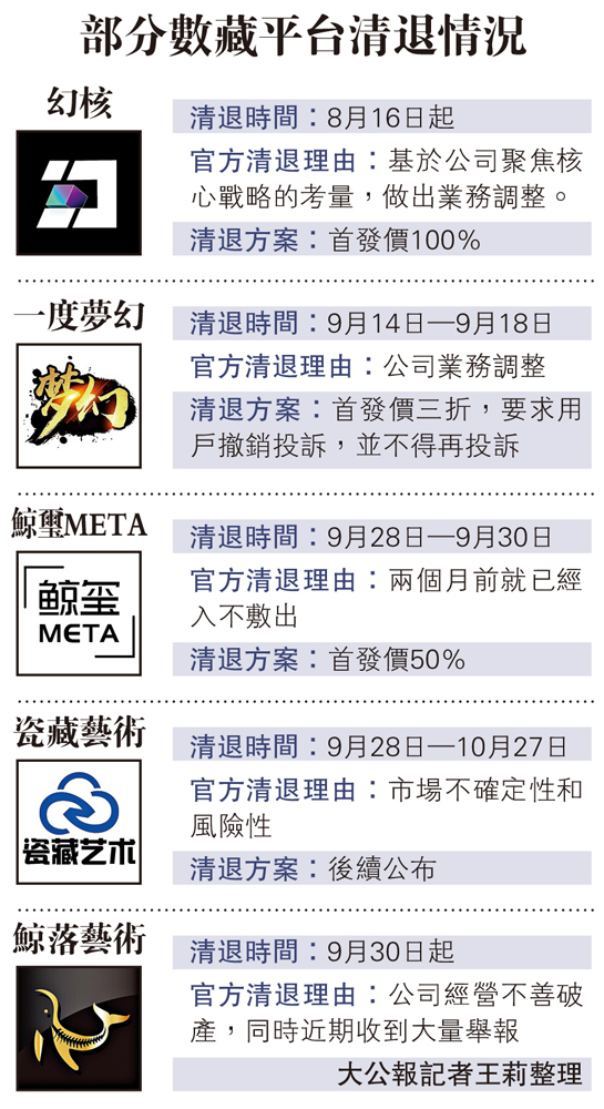 (大公報 記者 王莉)近期,騰訊宣布,旗下經營了一年十四天的數字藏品平台幻核正式停止發行。消息猶如重磅炸彈,給近來一路下滑的數字藏品市場雪上加霜。一年前,無論大小平台只要上新,款款秒殺,二級市場更是百倍增值;而一年後,藏品滯銷,價格破發,「大廠」離場,「小廠」跑路。據不完全統計,僅9月份就有21家數藏平台發布清退公告。數字藏品市場熱潮褪去,後續該何去何從,成了賣家、買家及平台共同面對的問題。「像我們這樣繼續撐着的,都盼望盡快出台清晰的行業政策與規定。」杭州某數字藏品平台經營者沈佶(化名)道出業界心聲。