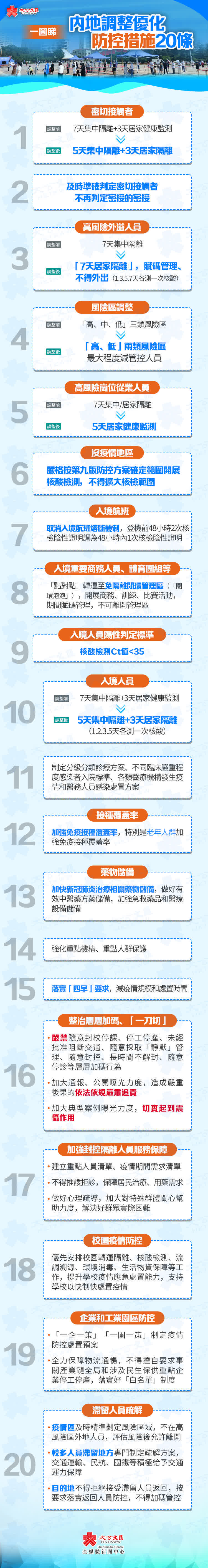 對當前在管的集中隔離管理滿8天,且符合「人、物、環境」核酸檢測結果為陰性的人員,即時解除集中隔離;對集中隔離管理滿5天但不足8天,且「人、物、環境」核酸檢測結果為陰性的人員,可解除集中隔離,閉環接轉返回社區後繼續完成1-3天居家隔離。