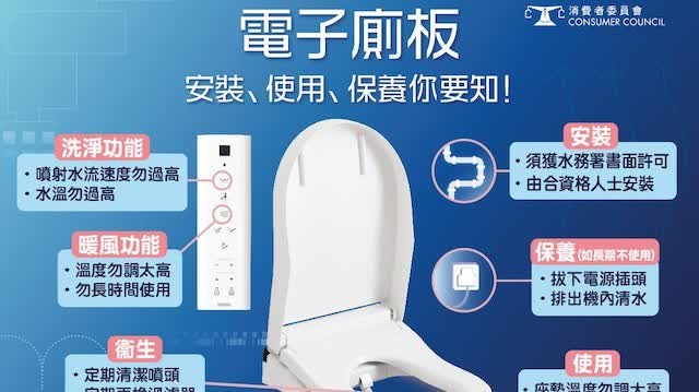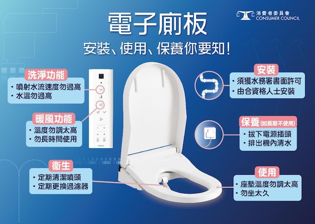 消委會指出,電子廁板主要在衞浴潔具店舖、電器店舖及網店出售,安裝時需要接駁食水供應喉管,安裝工程須獲得水務署的書面許可,並由合資格人士安裝,以免污水回流而污染單位或樓宇的供水系統。由於洗手間通常比較潮濕,因此切勿使用拖板。如需加裝電源插座,必須由註冊電業承辦商進行。