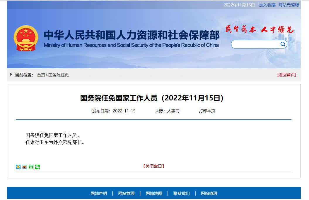 據人社部網站今日(15日)公布,國務院任免國家工作人員。任命孫衛東為外交部副部長。