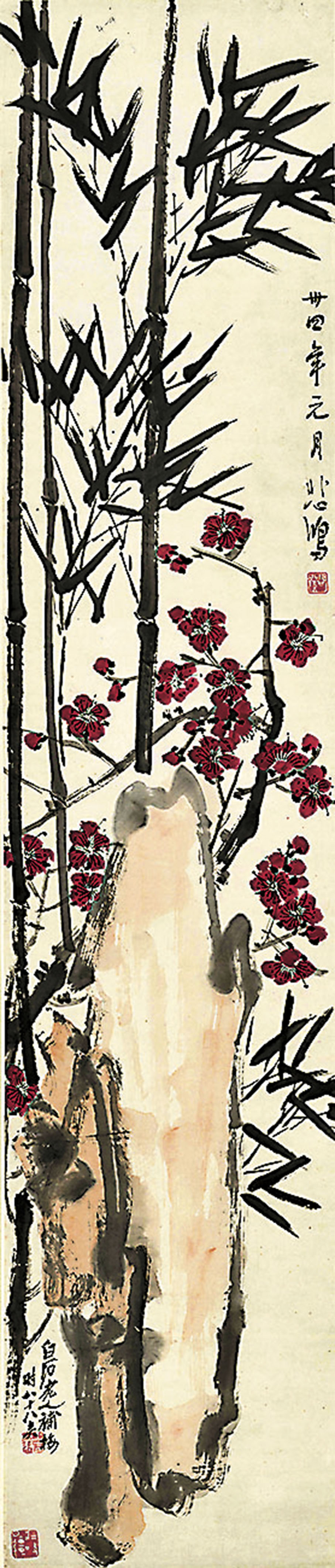 展覽是本次「藝文香港」活動的重點版塊,共展出現當代藝術家作品近40幅。展覽現場特設大師作品展區,甄選吳冠中、林風眠、陳樹人、傅抱石、齊白石及徐悲鴻6位中國現代藝術大師的經典巨作。作為探索中國藝術現代性的先驅人物,他們的作品各具特色,且具有融會東西方藝術特點的共通性,為中國藝術開闢了創新之路。值得一提的是,此次特別展出齊白石與徐悲鴻合作創作的作品《梅竹》,作品由徐悲鴻畫竹、石,齊白石補梅,梅花以較低的構圖隱隱藏於竹石之間,表現了齊白石在忘年知己面前的謙虛與感激。兩人以花中君子為題,在作品中互為唱和、相互成就,展現了二人君子莫逆之交的情誼。