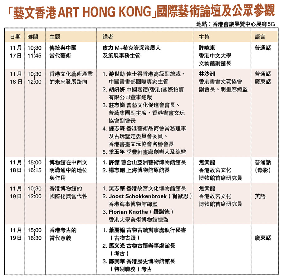 展覽同期還將舉辦5場有關中西文化藝術現狀及藝術交易市場發展趨勢等主題的國際藝術論壇,以「藝通中外 文貫古今」為主題,邀請多位來自香港及內地文化藝術界的知名人士,圍繞傳統與中國當代藝術、博物館在中西文明溝通中的地位和作用、香港文化藝術產業的未來發展路向、香港考古的當代意義等話題展開對話,從資源、品牌、活動等方面立體推動香港與內地、中國與海外的藝術交流,講好中國故事,促進中華文化藝術的普及,營造「人人參與文化、人人享受文化」的氛圍。