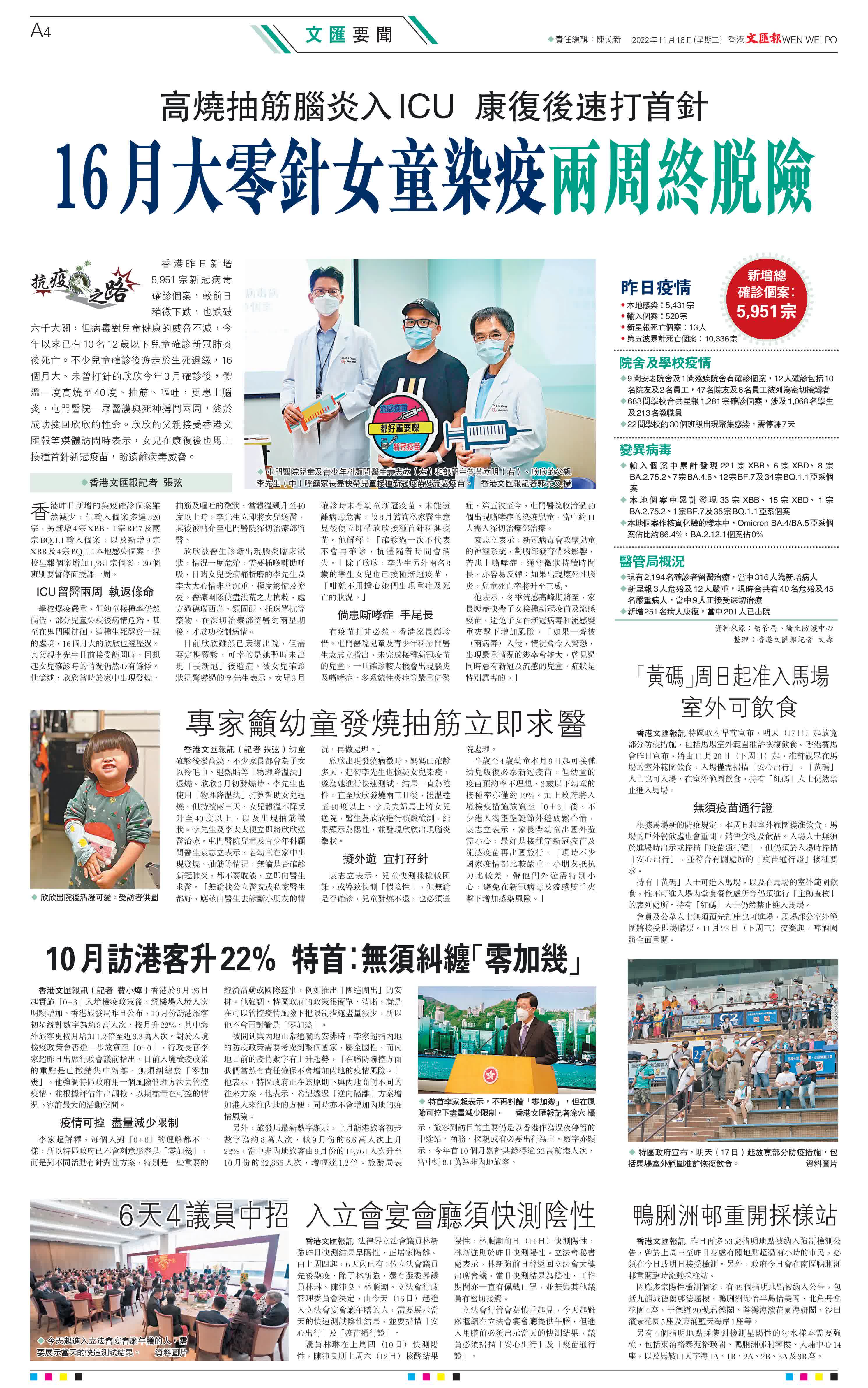 (香港文匯報記者 張弦)香港昨日新增5,951宗新冠病毒確診個案,較前日稍微下跌,也跌破六千大關,但病毒對兒童健康的威脅不減,今年以來已有10名12歲以下兒童確診新冠肺炎後死亡。不少兒童確診後遊走於生死邊緣,16個月大、未曾打針的欣欣今年3月確診後,體溫一度高燒至40度、抽筋、嘔吐,更患上腦炎,屯門醫院一眾醫護與死神搏鬥兩周,終於成功撿回欣欣的性命。欣欣的父親接受香港文匯報等媒體訪問時表示,女兒在康復後也馬上接種首針新冠疫苗,盼遠離病毒威脅。