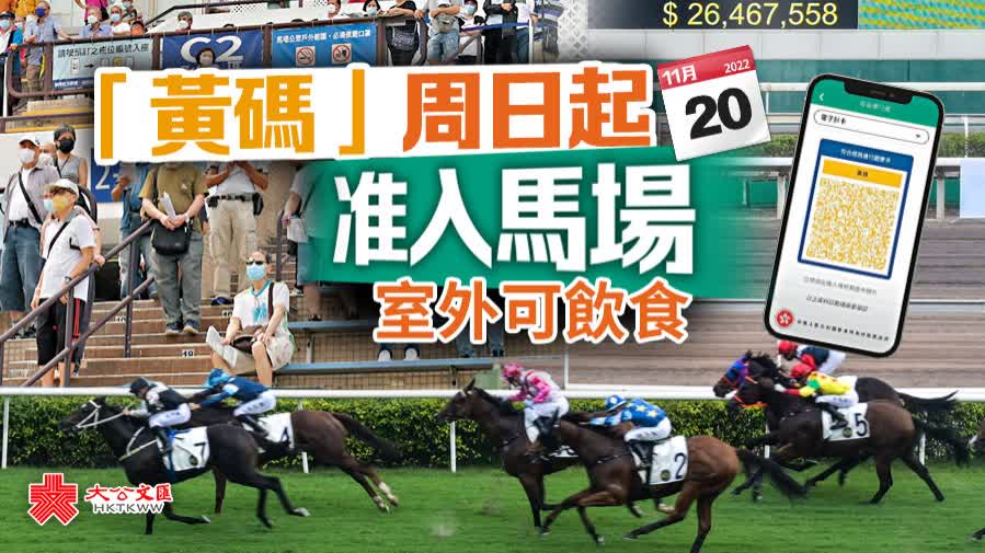 香港文匯報報道,特區政府早前宣布,明天(17日)起放寬部分防疫措施,包括馬場室外範圍准許恢復飲食。香港賽馬會昨日宣布,將由11月20日(下周日)起,准許觀眾在馬場的室外範圍飲食,入場僅需掃描「安心出行」,「黃碼」人士也可入場、在室外範圍飲食。持有「紅碼」人士仍然禁止進入馬場。