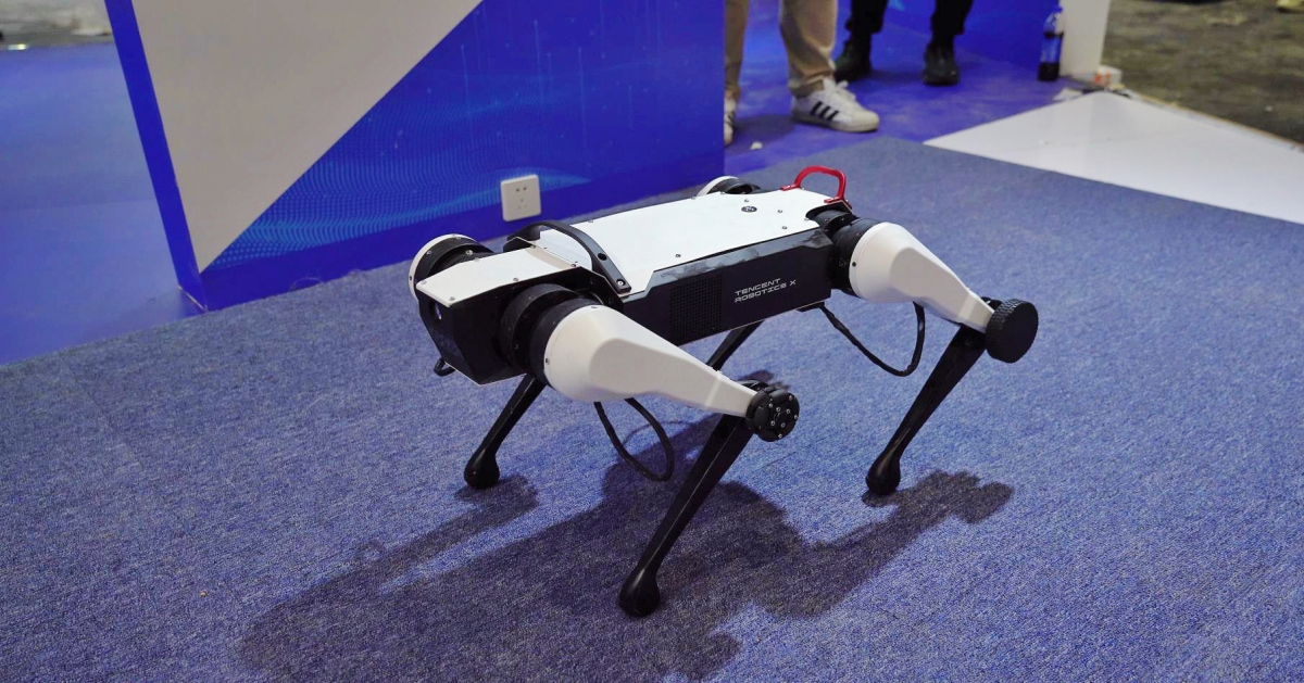 最引人註目的是騰訊Robotics X實驗室自研的多模態四足機械人Max,它創新性的足輪融合一體式設計,可以實現「崎嶇路面走得穩,平坦路面跑得快」,並且在2022年完成高難度梅花樁挑戰。活動現場,Max也給大家展示了足、輪模態運動及空翻等動作,展現出走在行業前沿的靈敏運動能力。