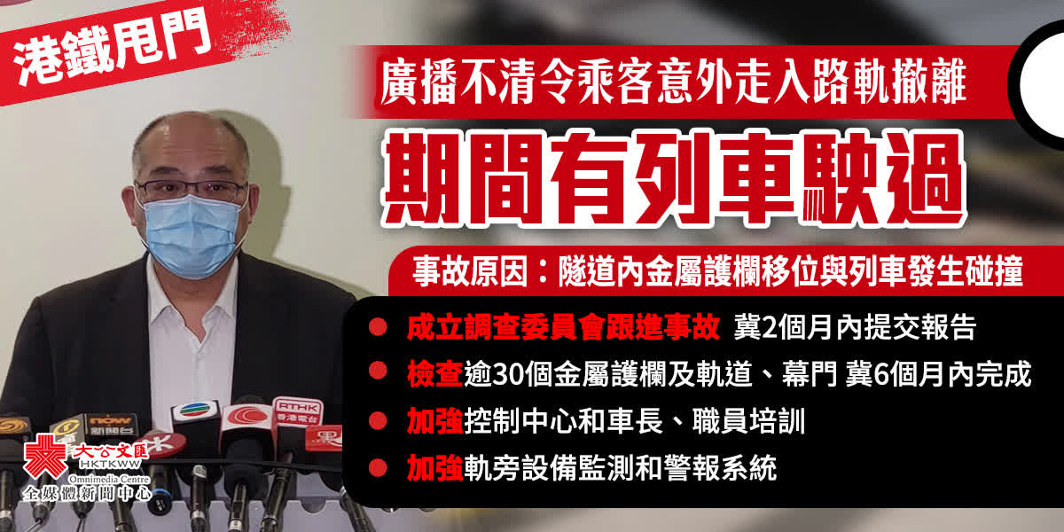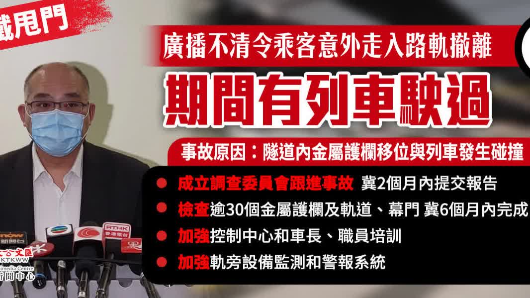 機電署指,已於事發翌日(14日)指示港鐵公司就整個鐵路網絡的軌旁設施及構築物進行全面檢視,確保它們安全穩妥,並制定嚴謹的定期檢查及維修保養措施,確保鐵路系統安全可靠。機電署會委聘獨立專家為改善措施、設備狀況評估和維護計劃提供意見,確保維修保養措施合適得宜及鐵路運作安全。