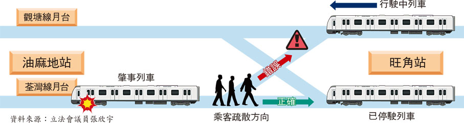 港鐵車務總監李家潤昨日在記者會上表示,初步掌握的資料顯示,在事故發生期間,由於肇事的荃灣線列車有兩卡車廂已進入油麻地站月台,車務控制中心在評估情況後,原意是安排乘客在職員協助下,從車頭幕門離開車廂到油麻地站月台,車務控制中心與車長亦一直保持溝通,「然而當日車上廣播內容可能有不足的地方,未有充分清晰指示乘客離開車廂的安排,以致有部分乘客往車尾方向,推開車尾緊急出口的斜道離開車廂。」
