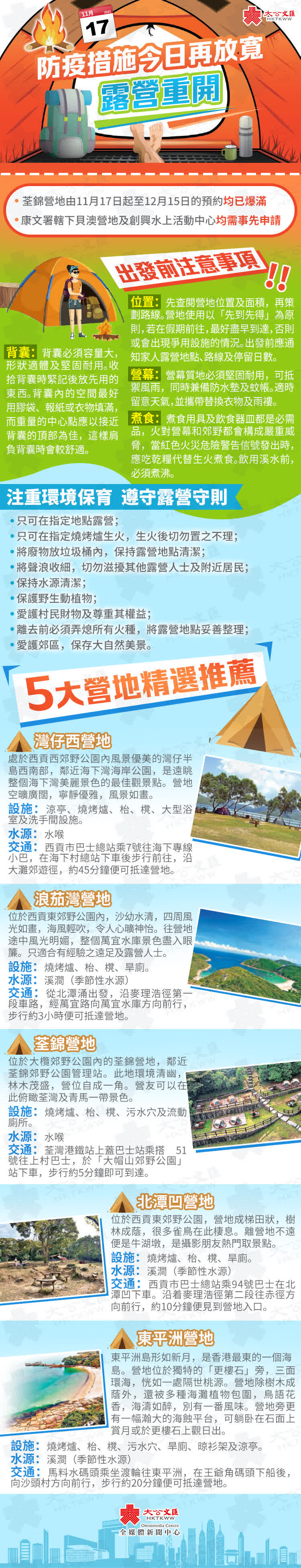 (大公報記者 賴振雄)防疫措施今日(17日)進一步放寬,政府轄下露營地點於關閉超過八百六十日後終於重開,不少市民已經準備就緒,走進山旮旯感受郊遊樂,大公報記者發現,漁農自然護理署唯一提供網上預約的荃錦營地,由即日起至12月15日的預約均已爆滿,有網民估計將會出現「營迫營」狀況。