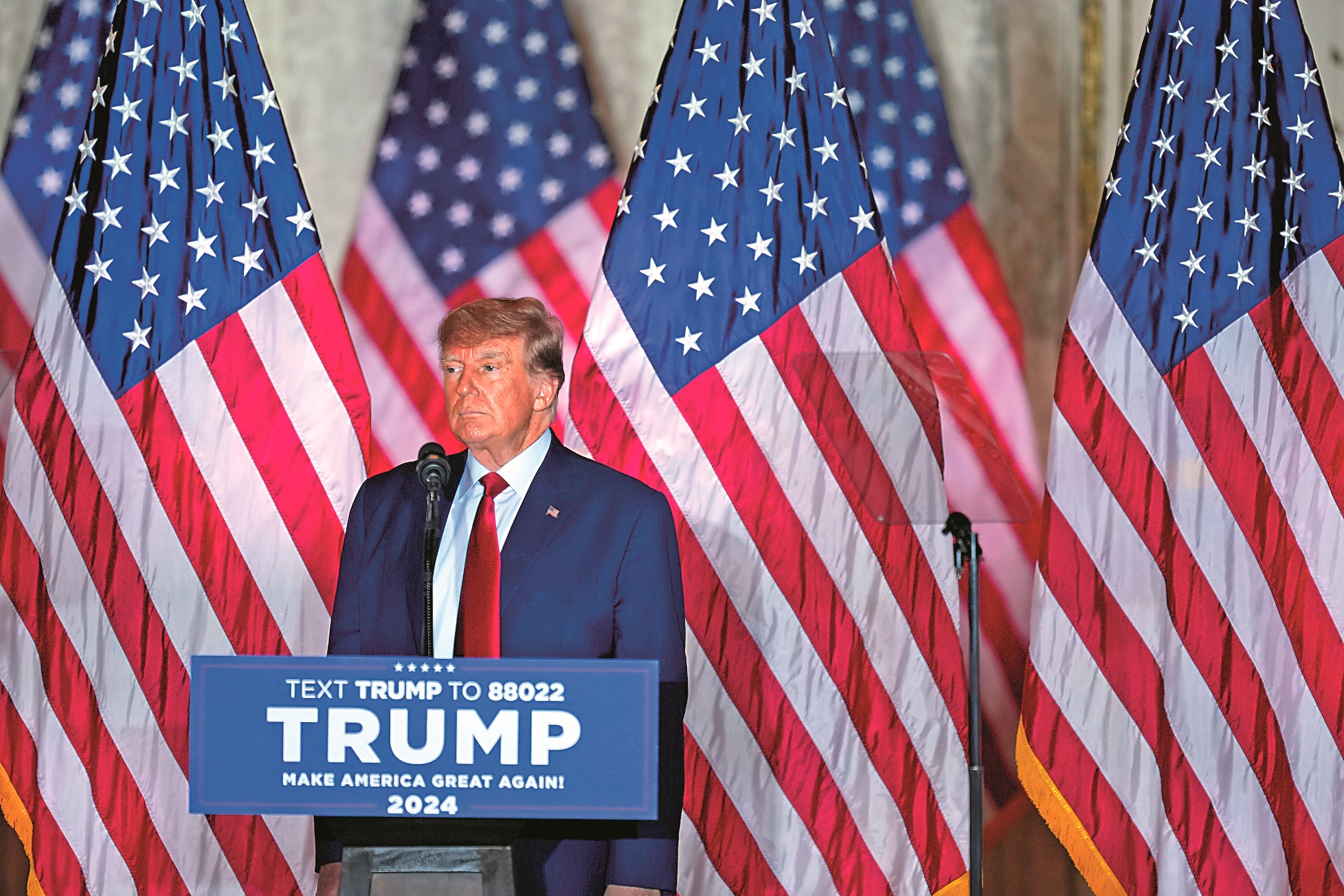 朗普當地時間15日晚在海湖莊園向數百名支持者表示,「為了讓美國再次偉大和輝煌」,將參加2024年美國總統大選。這是特朗普第三次競選總統。此前只有克利夫蘭是唯一一位兩度當選且任期不連續的美國總統,他在1888年競選連任失利,但在1892年再度成功當選。