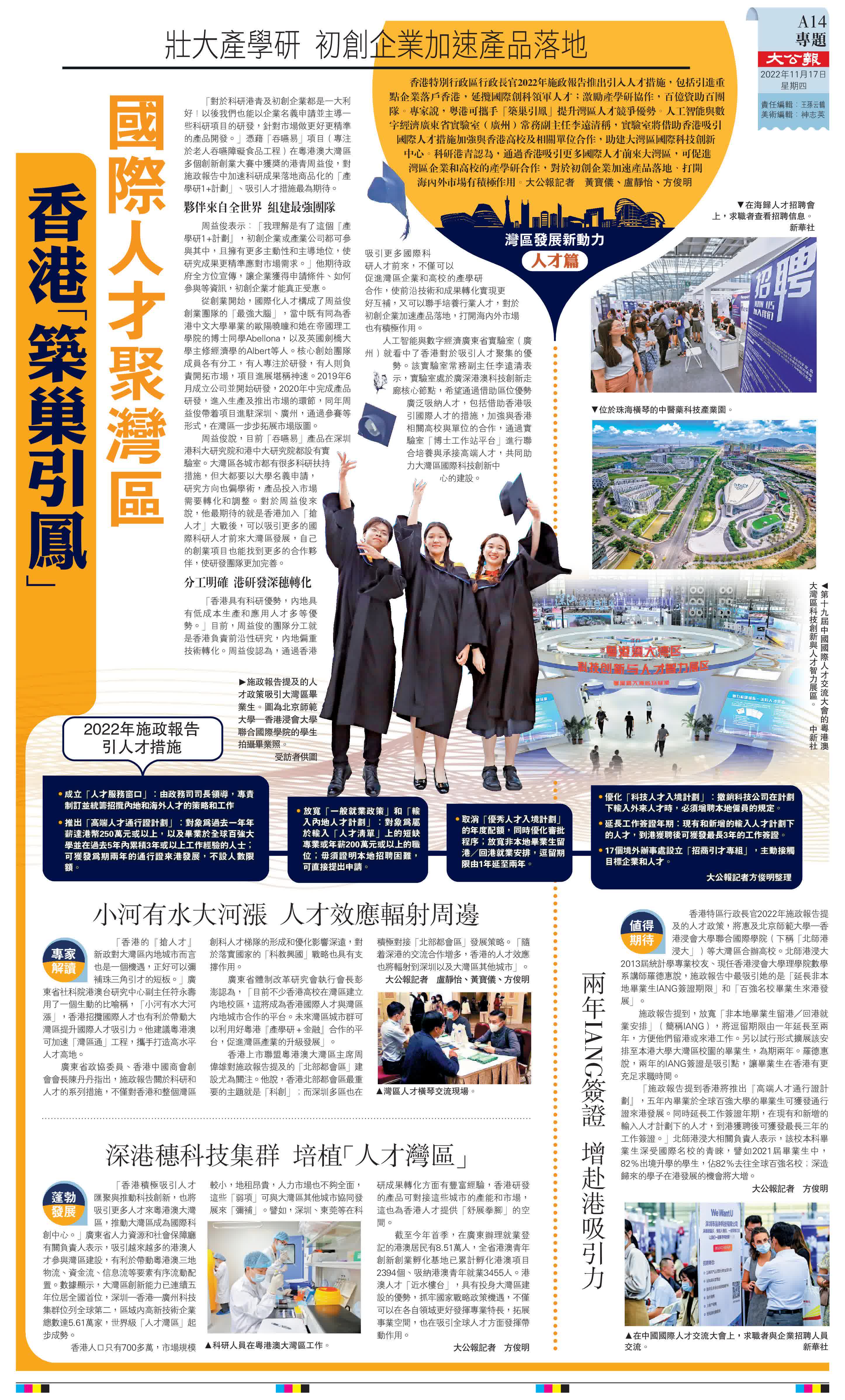 (大公報記者 黃寶儀、盧靜怡、方俊明)香港特別行政區行政長官2022年施政報告推出引入人才措施,包括引進重點企業落戶香港,延攬國際創科領軍人才;激勵產學研協作,百億資助百團隊。專家說,粵港可攜手「築巢引鳳」提升灣區人才競爭優勢。人工智能與數字經濟廣東省實驗室(廣州)常務副主任李遠清稱,實驗室將借助香港吸引國際人才措施加強與香港高校及相關單位合作,助建大灣區國際科技創新中心。科研港青認為,通過香港吸引更多國際人才前來大灣區,可促進灣區企業和高校的產學研合作,對於初創企業加速產品落地、打開海內外市場有積極作用。