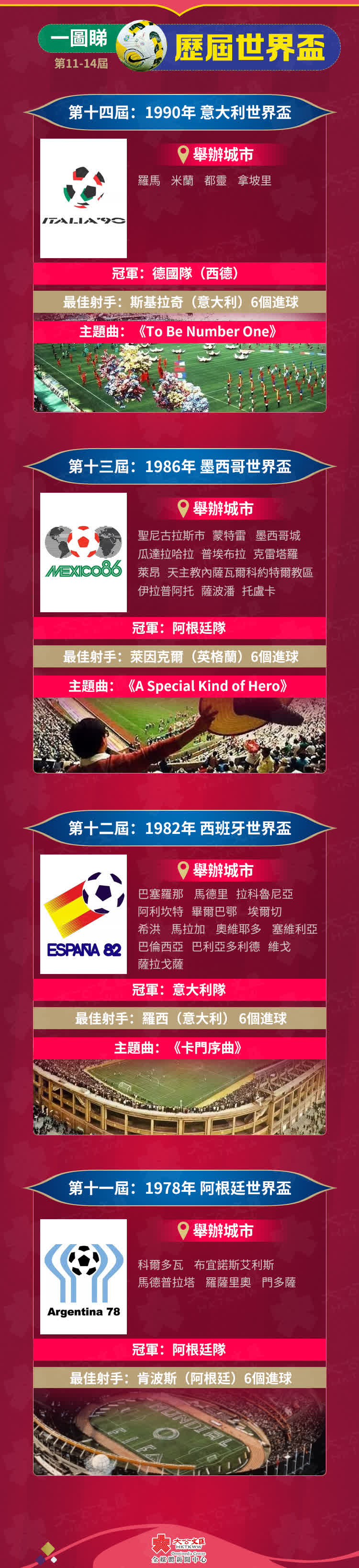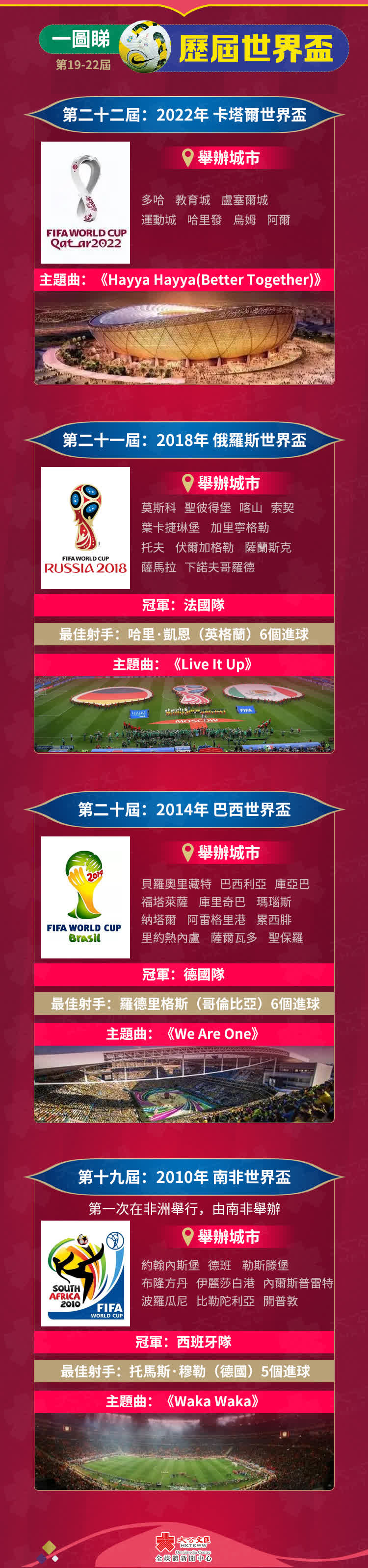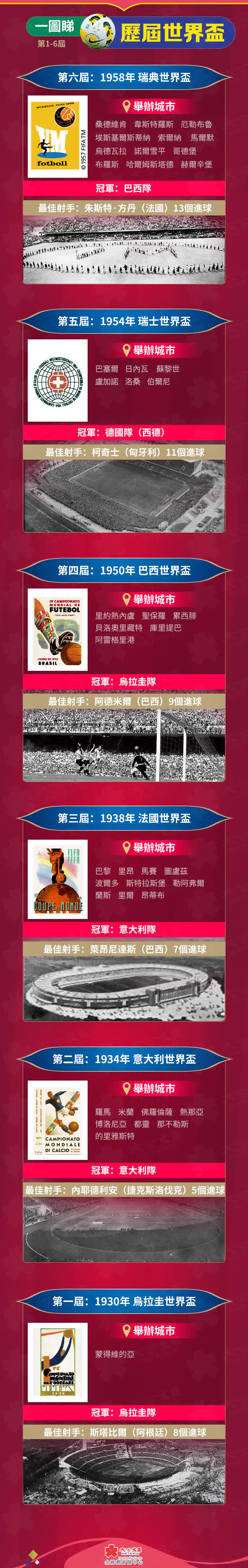 當地時間11月20日19時,全球將迎來四年一度的國際足球盛事——2022年卡塔爾世界盃(FIFA World Cup Qatar 2022),這是史上首次在卡塔爾和中東國家境內舉行、首次在北半球冬季舉行、也是第二次在亞洲舉行的世界盃足球賽,32支球隊將在中東酋長國上演64場激鬥。從1930年烏拉圭世界盃至今,FIFA World Cup已經歷經二十一屆,大公文匯全媒體為您整理歷屆世界盃簡況,讓你一文回顧歷屆主題曲、冠軍球隊、最佳射手……
