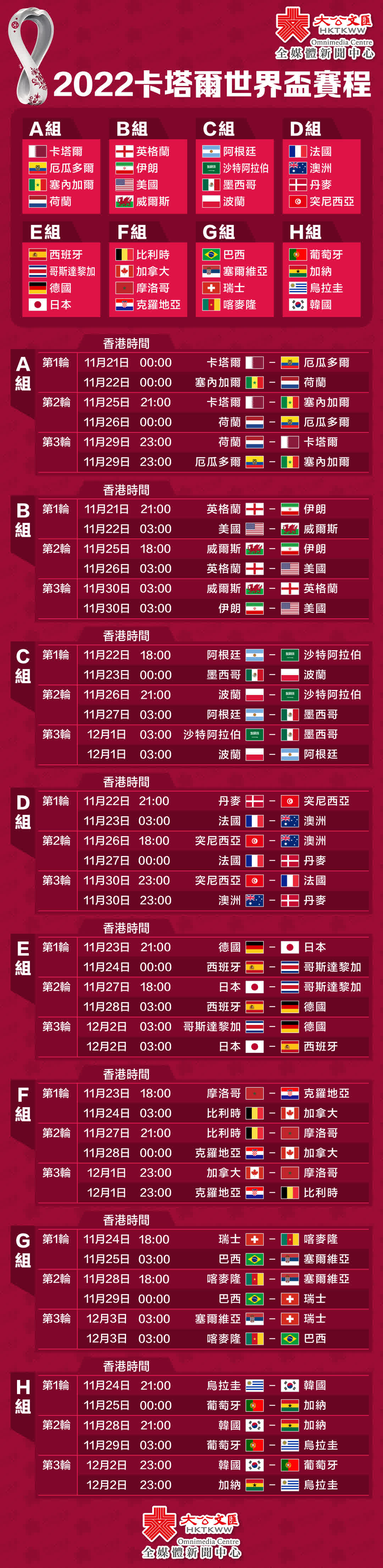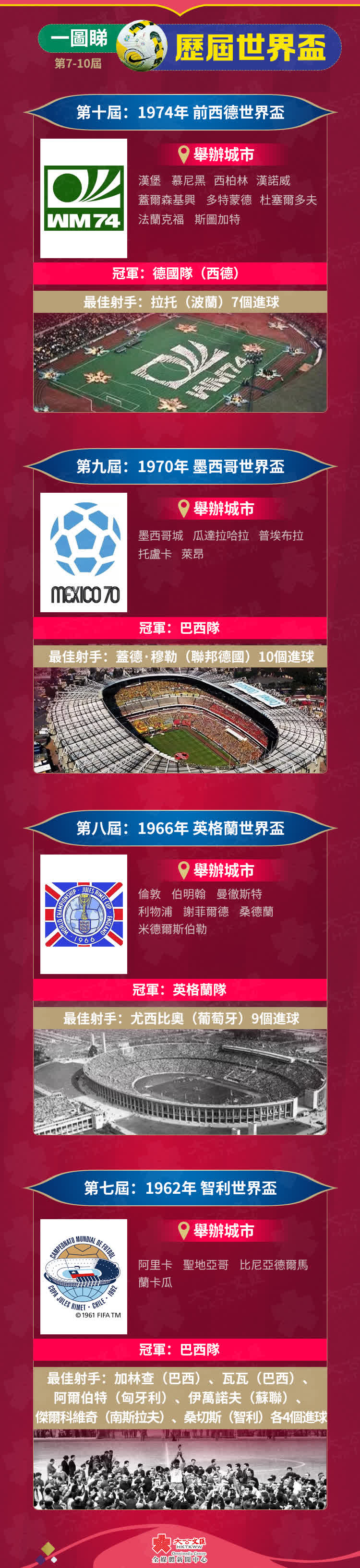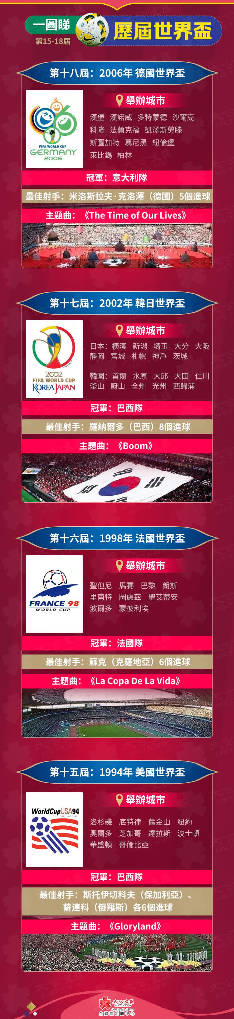 當地時間11月20日19時,全球將迎來四年一度的國際足球盛事——2022年卡塔爾世界盃(FIFA World Cup Qatar 2022),這是史上首次在卡塔爾和中東國家境內舉行、首次在北半球冬季舉行、也是第二次在亞洲舉行的世界盃足球賽,32支球隊將在中東酋長國上演64場激鬥。從1930年烏拉圭世界盃至今,FIFA World Cup已經歷經二十一屆,大公文匯全媒體為您整理歷屆世界盃簡況,讓你一文回顧歷屆主題曲、冠軍球隊、最佳射手……