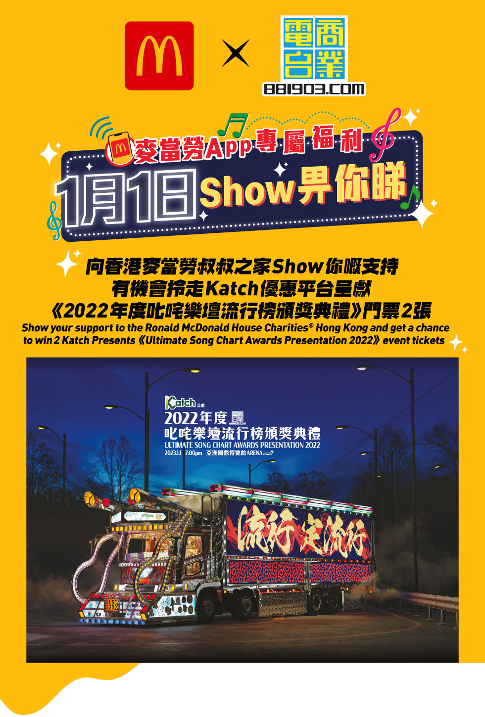 大公文匯全媒體報道,麥當勞今日(17日)表示,與商業電台合作推出「1月1日 SHOW 畀你睇」活動,即日起至12月4日(晚上11時59分或之前),凡於手機或餐廳內的點餐機掃瞄麥當勞App內的指定捐款券,並捐贈90.3元予香港麥當勞叔叔之家慈善基金,即有機會獲得一票難求的《2022年度叱咤樂壇流行榜頒獎典禮》門票兩張。