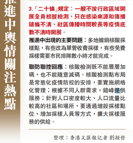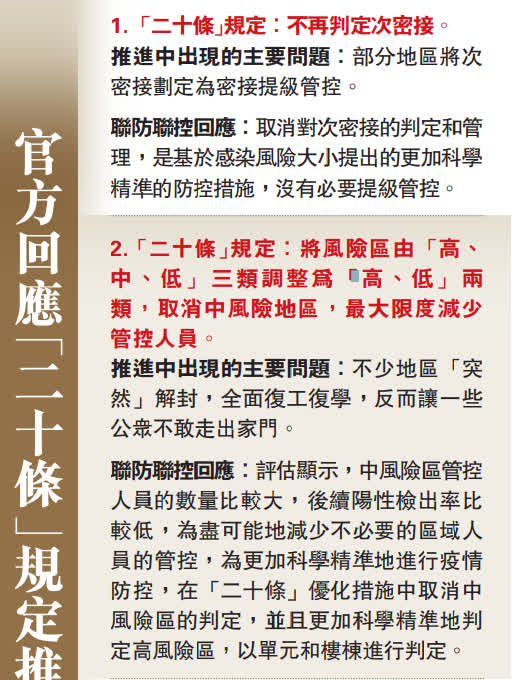 國家衞健委新聞發言人米鋒表示,「二十條」措施發布以來,各地正迅速貫徹落實,細化執行方案,在隔離轉運、核酸檢測、人員流動、醫療服務等方面採取更為精準的措施。一些地方在及時糾正與第九版方案和「二十條」措施不相符的做法,進一步提高疫情防控的科學性、精準性、有效性。他強調,要堅決反對兩種傾向,既要持續整治層層加碼,防止「一封了之」,又要反對不負責任的態度,防止「一放了之」,保障好「二十條」措施不折不扣落地落實,保障好人民群眾生命安全和身體健康。