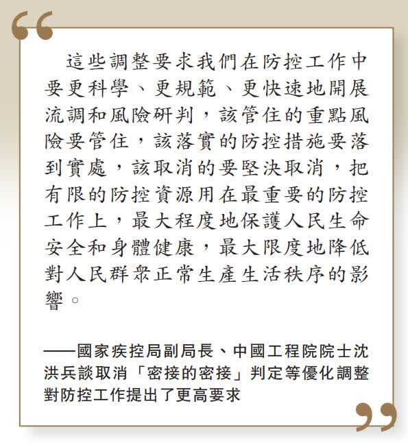 這些調整要求我們在防控工作中要更科學、更規範、更快速地開展流調和風險研判,該管住的重點風險要管住,該落實的防控措施要落到實處,該取消的要堅決取消,把有限的防控資源用在最重要的防控工作上,最大程度地保護人民生命安全和身體健康,最大限度地降低對人民群眾正常生產生活秩序的影響。——國家疾控局副局長、中國工程院院士沈洪兵談取消「密接的密接」判定等優化調整對防控工作提出了更高要求。