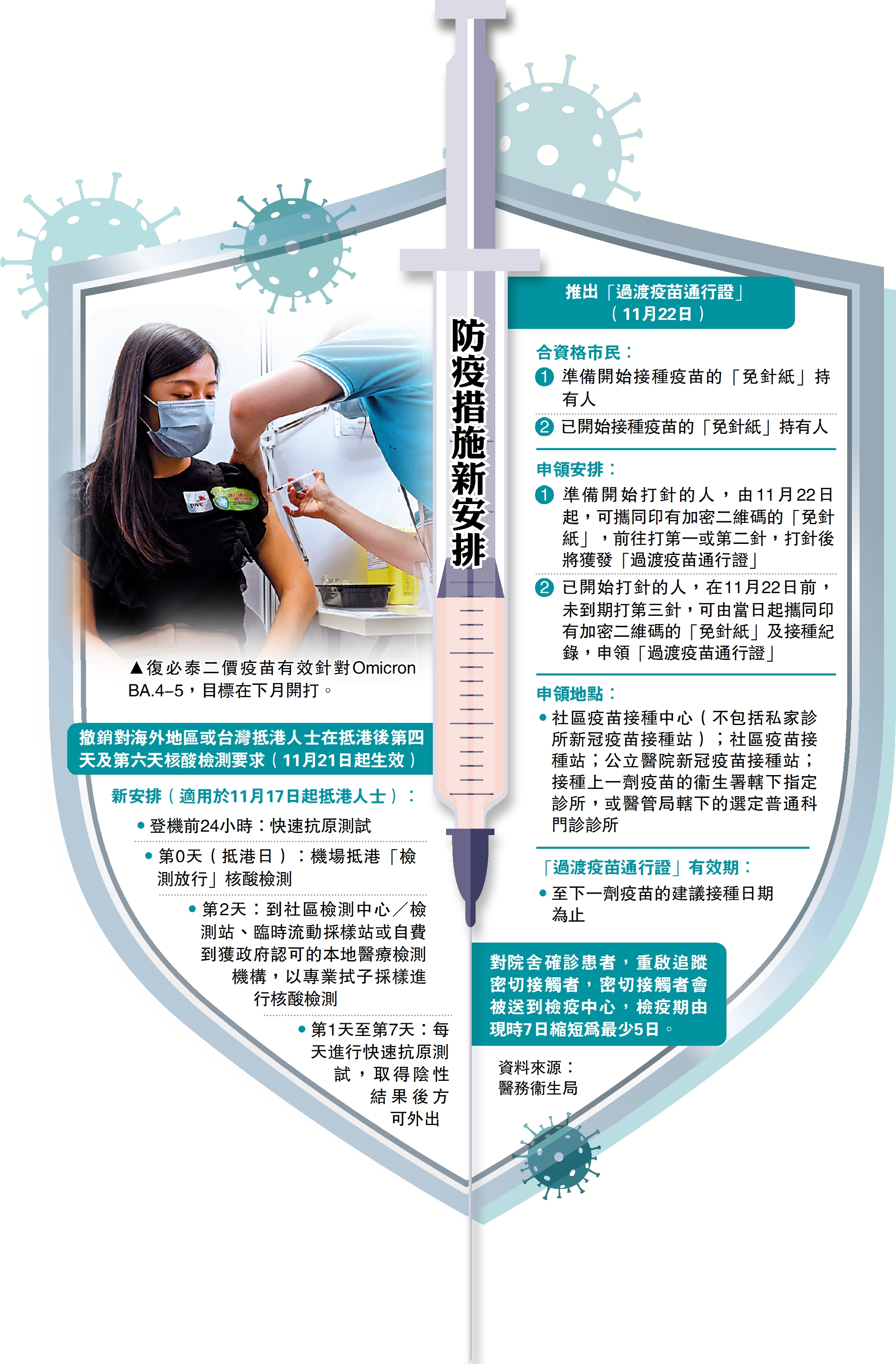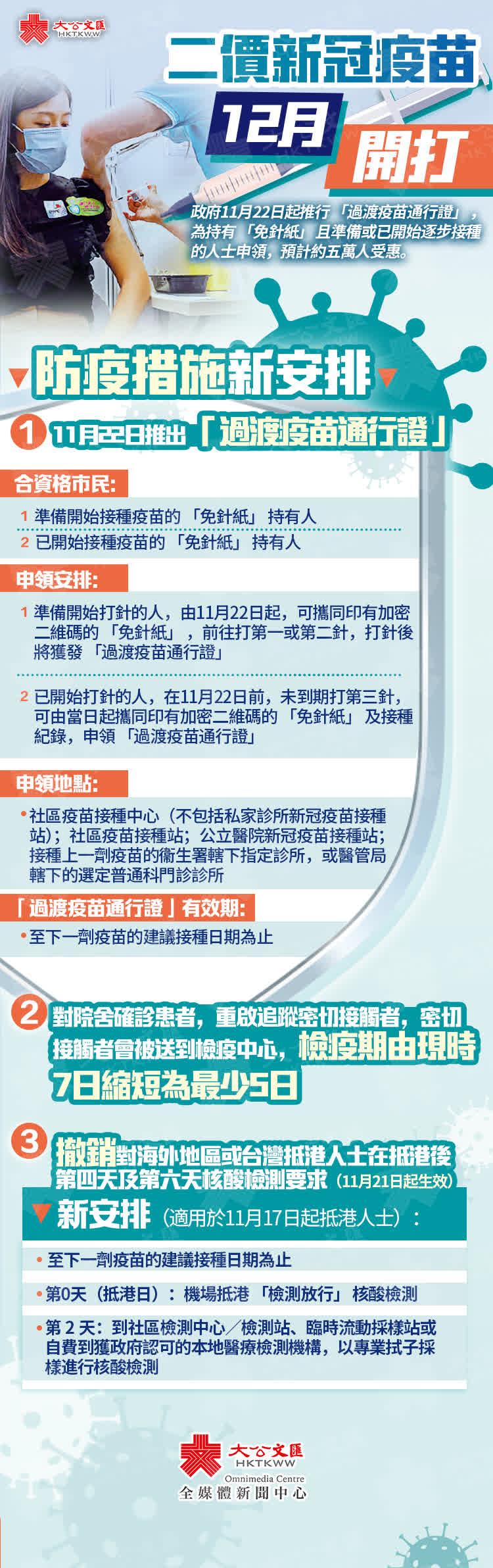 此外,政府早前宣布,本月30日起將調整「疫苗通行證」接種要求,12歲或以上人士須已接種三劑疫苗才可進入表列處所,因應安排,政府將於本月22日為持有「免針紙」人士推出過渡安排,容許相關人士可在開始接種疫苗但尚未符合「疫苗通行證」接種要求期間,獲發「過渡疫苗通行證」,以進入相關處所。