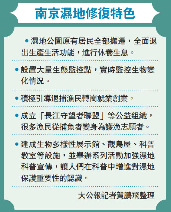 (大公報記者 賀鵬飛)初冬時節,位於江蘇南京長江之中的新濟州國家濕地公園成了候鳥的天堂,白琵鷺、小天鵝、斑嘴鴨、綠翅鴨等大量候鳥自西伯利亞和北歐等地跋涉千里而前來過冬,吸引大批觀鳥愛好者觀賞。2016年以來,南京累計完成濕地修復約2萬畝,其中修復沿江濕地約1萬畝。「人搬走了,鳥獸回來了。」良好的生態環境吸引了大量的珍稀鳥類和魚類重返南京,一度瀕臨滅絕,被形容為「微笑天使」的長江江豚也頻頻浮現於南京江面。