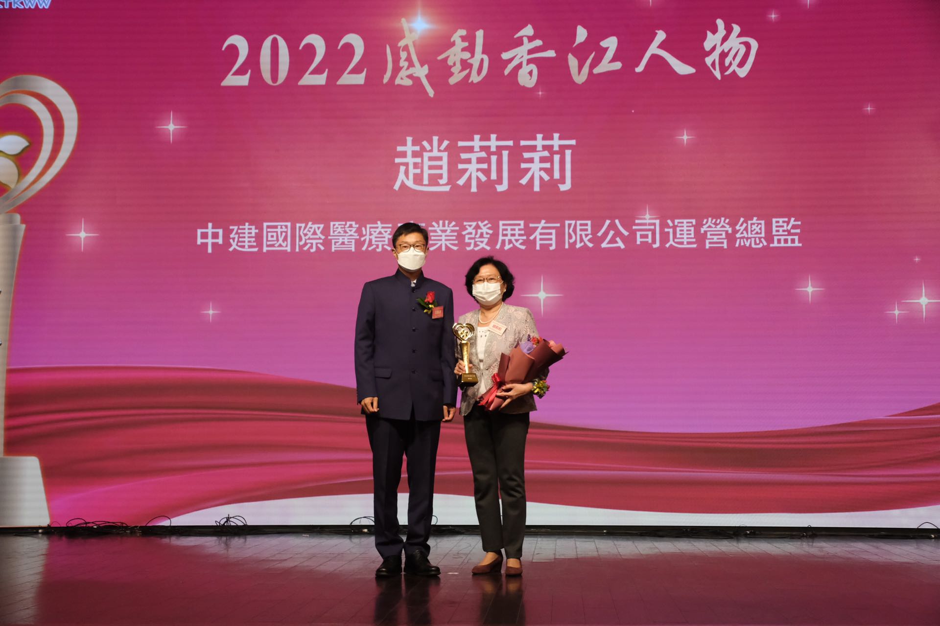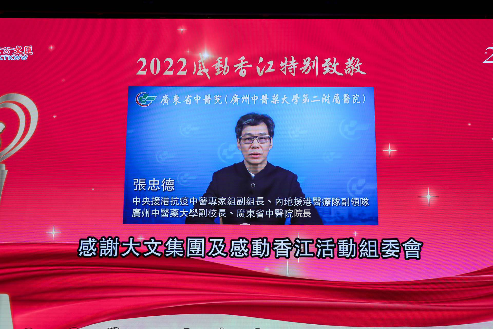 此外,「2022感動香江特別致敬」授予在第五波疫情洶湧襲港期間暫別親友,用心血、汗水、真情奮戰在香港抗疫一線的內地援港醫療團隊。中央援港抗疫中醫專家組副組長、內地援港醫療隊副領隊、廣州中醫藥大學副校長、廣東省中醫院院長張忠德以視頻發表獲獎感言時表示,感謝大文集團及「感動香江」活動組委會對援港醫療隊的認可。