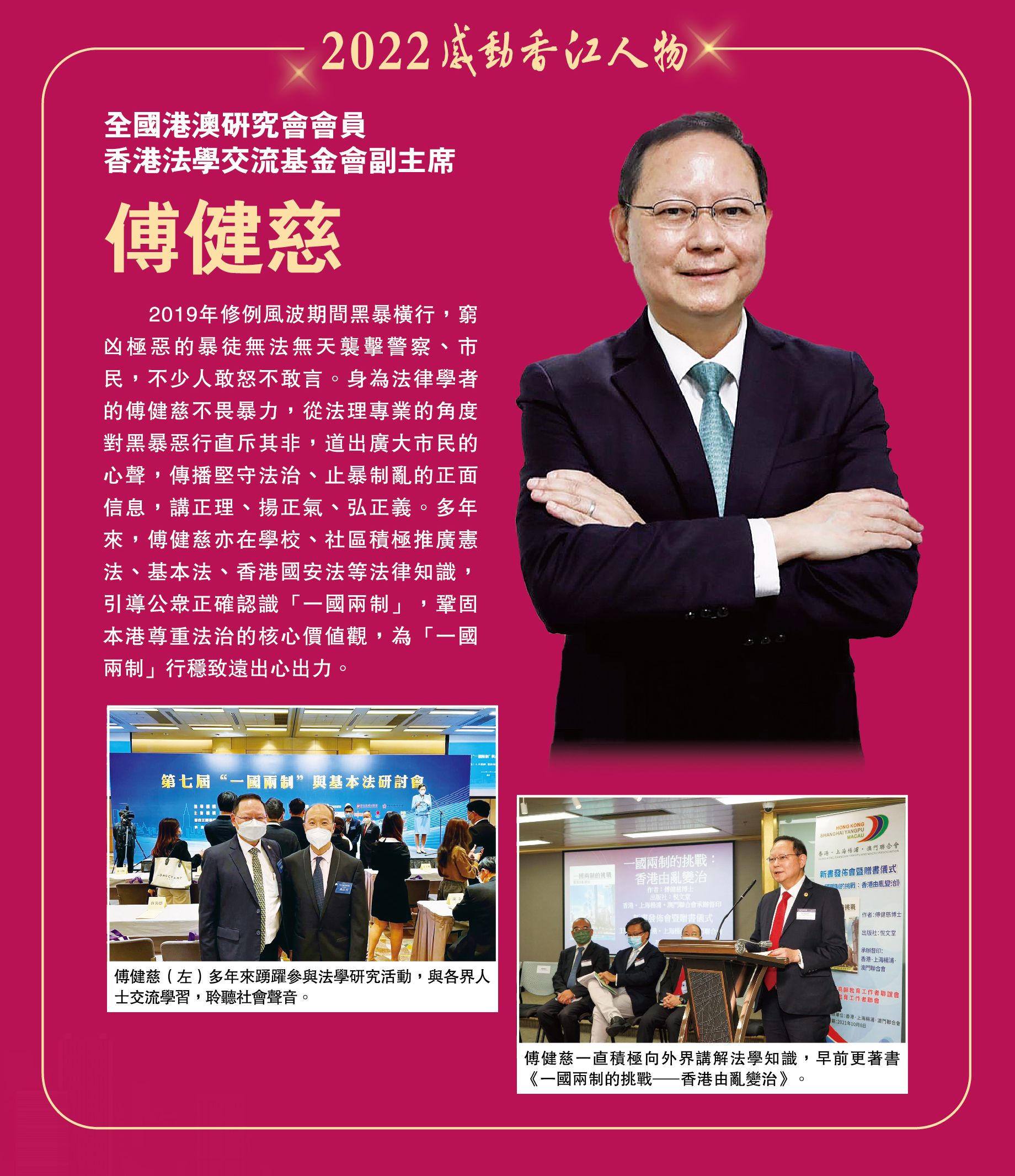 2019年修例風波期間黑暴橫行,窮凶極惡的暴徒無法無天襲擊警察、市民,不少人敢怒不敢言。身為法律學者的傅健慈不畏暴力,從法理專業的角度對黑暴惡行直斥其非,道出廣大市民的心聲,傳播堅守法治、止暴制亂的正面信息,講正理、揚正氣、弘正義。多年來,傅健慈亦在學校、社區積極推廣憲法、基本法、香港國安法等法律知識,引導公眾正確認識「一國兩制」,鞏固本港尊重法治的核心價值觀,為「一國兩制」行穩致遠出心出力。