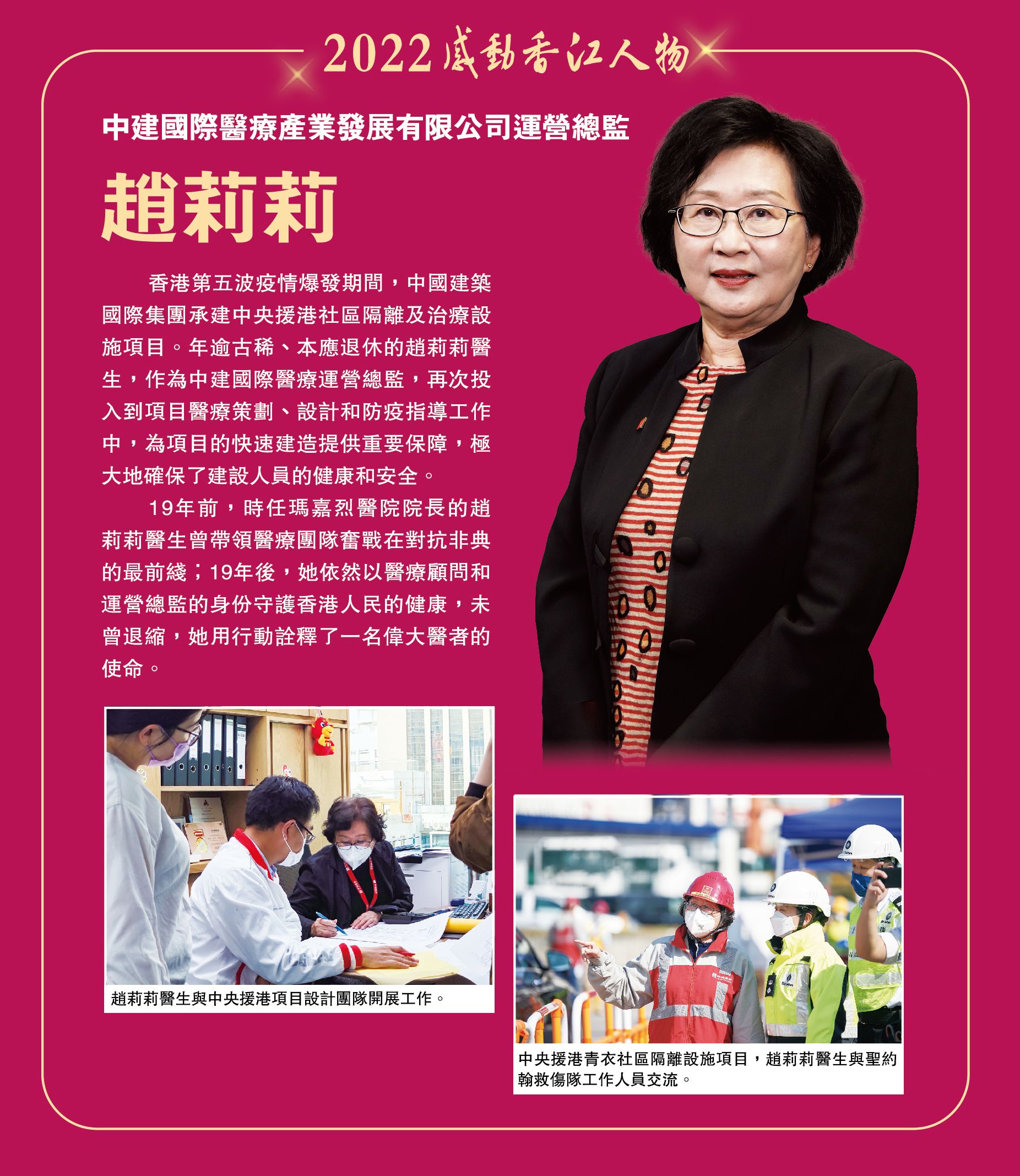 香港第五波疫情爆發期間,中國建築國際集團承建中央援港社區隔離及治療設施項目。年逾古稀、本應退休的趙莉莉醫生,作為中建國際醫療運營總監,再次投入到項目醫療策劃、設計和防疫指導工作中,為項目的快速建造提供重要保障,極大地確保了建設人員的健康和安全。