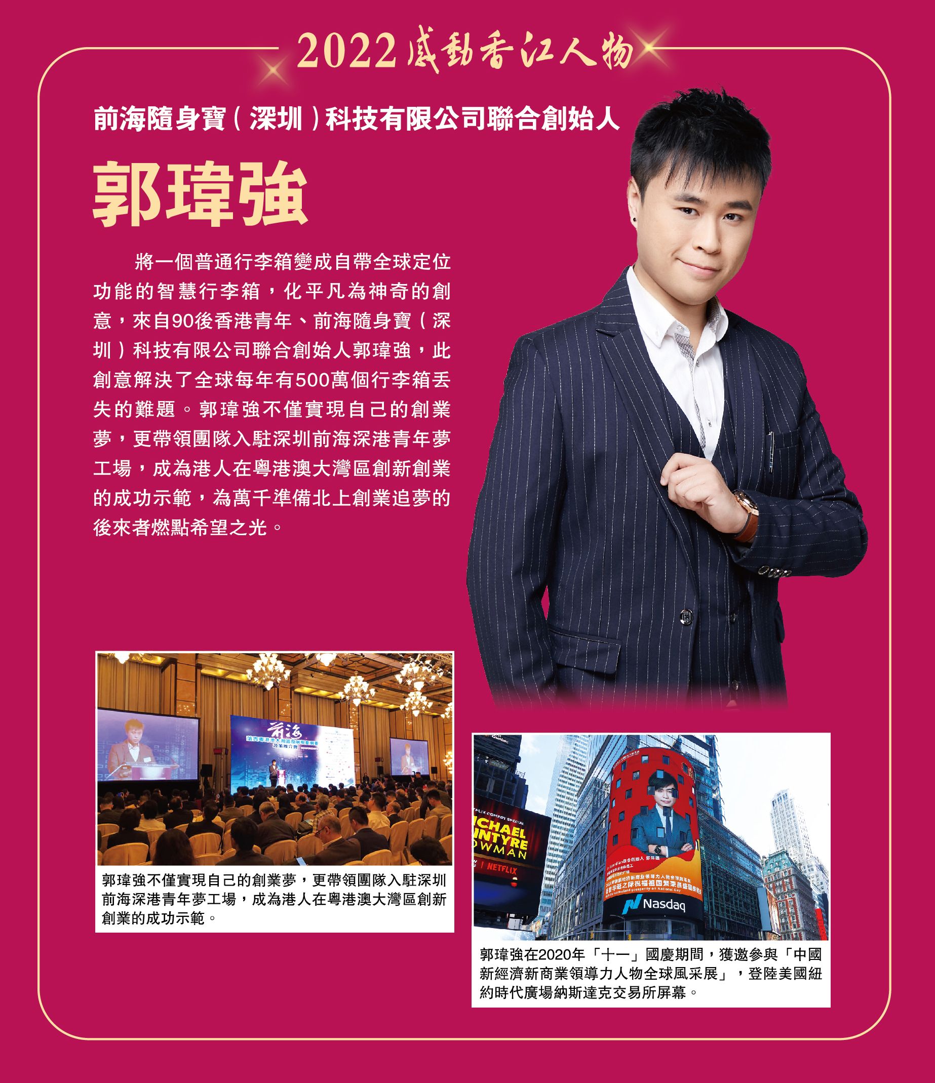 將一個普通行李箱變成自帶全球定位功能的智慧行李箱,化平凡為神奇的創意,來自90後香港青年、前海隨身寶(深圳)科技有限公司聯合創始人郭瑋強,此創意解決了全球每年有500萬個行李箱丟失的難題。郭瑋強不僅實現自己的創業夢,更帶領團隊入駐深圳前海深港青年夢工場,成為港人在粵港澳大灣區創新創業的成功示範,為萬千準備北上創業追夢的後來者燃點希望之光。