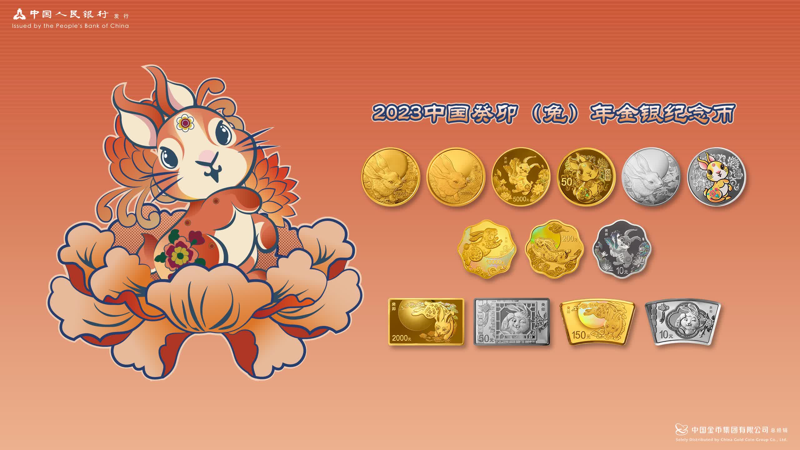 人民銀行公告稱,兔年生肖金銀幣的正面圖案均為國徽,襯以中國傳統吉祥紋飾,並刊國名「中華人民共和國」和年份「2023」。金銀幣的背面圖案共7種、13幅,均刊「癸卯」字樣及面額,其中:10公斤圓形金幣、2公斤圓形金幣及1公斤圓形銀幣背面圖案均為寫實兔造型,襯以月亮、祥雲組合設計;1公斤梅花形金幣背面圖案為裝飾兔造型,襯以裝飾紋樣;500克圓形金幣及30克梅花形銀幣背面圖案均為裝飾兔及白菜造型,襯以荷花、荷葉等組合設計;150克長方形金幣及10克扇形金幣背面圖案均為裝飾兔造型,襯以月亮、祥雲組合設計;15克梅花形金幣背面圖案為剪紙風格兔造型,襯以月亮、祥雲組合設計;3克圓形金幣及15克圓形銀幣背面圖案均為裝飾兔造型,襯以吉祥紋飾;150克長方形銀幣及30克扇形銀幣背面圖案均為卡通兔造型,襯以桂花、中國結、窗等組合設計。