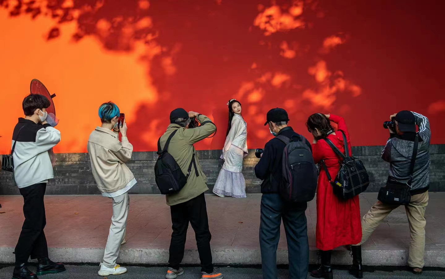 早於德壽宮遺址開館一個月,宮外一條長170米的紅色宮牆已新晉成為杭州最熱鬧的網紅打卡景點,每天來這裏拍照的遊客絡繹不絕。「上次沒有陽光,但發到朋友圈還是點讚過百。今天看到陽光明媚,拍出來的效果應該會更好。」杭州姑娘小馮是位設計師,這已是她第二次來到德壽宮紅牆拍照,「我覺得中式傳統美學才是『永遠的神』,魅力無窮。」