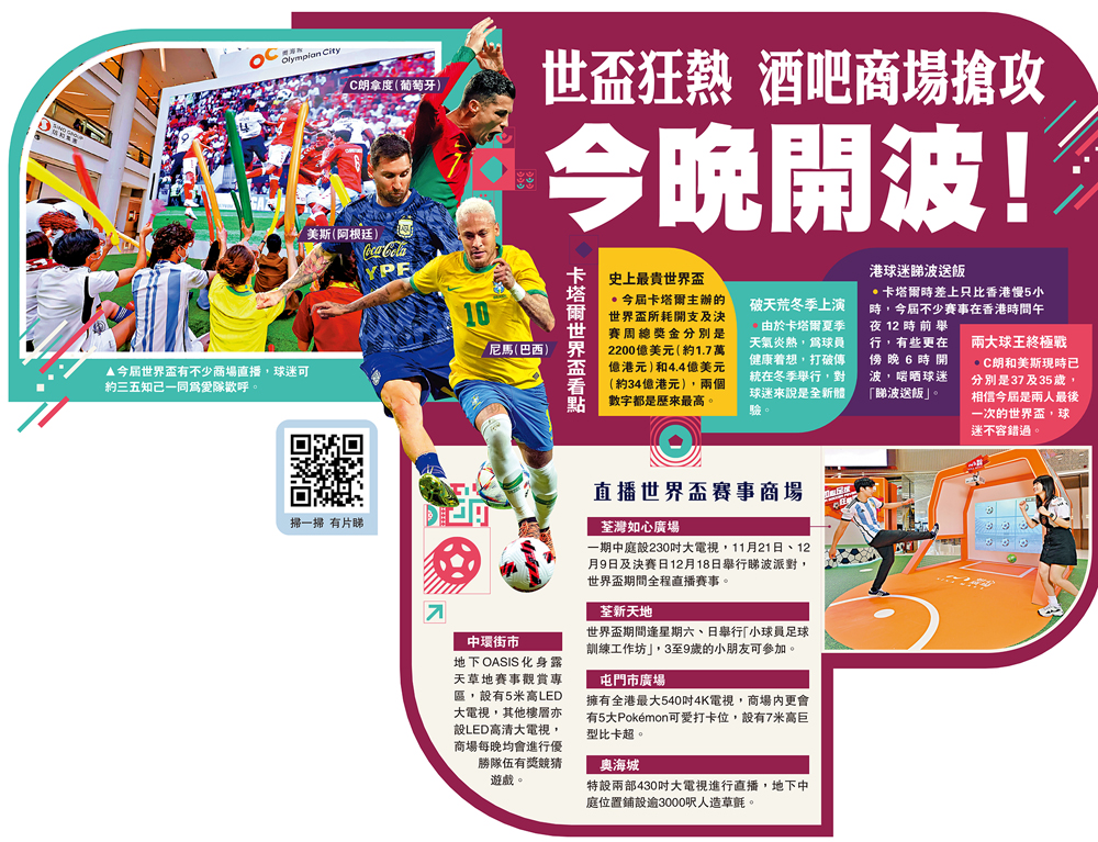 (大公報記者 伍軒沛、邵穎、鍾佩欣報道)破天荒在11月舉行,耗資1.7萬億港元打造、史上最貴的卡塔爾世界盃今晚午夜開鑼,港人準備就緒,迎接一個月的精彩足球賽事。