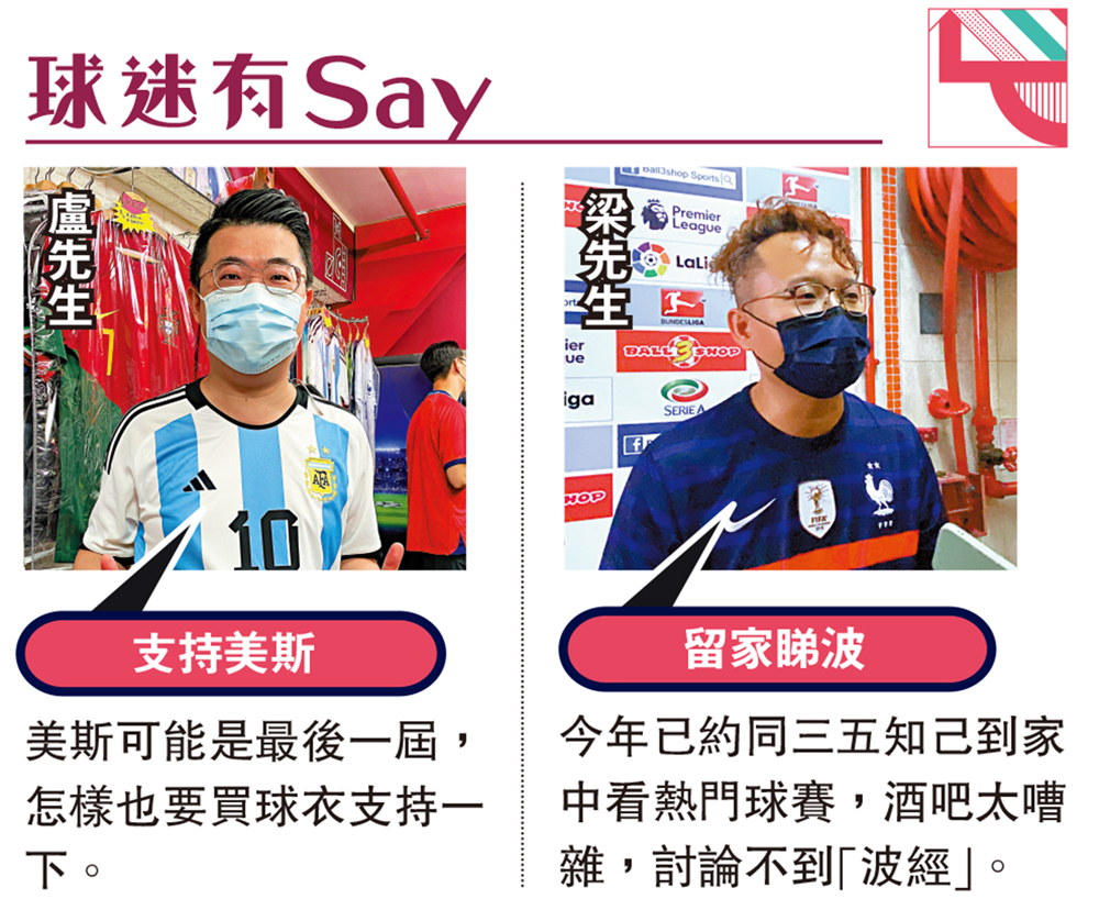 說到今年的熱門球衣,首選是阿根廷,球迷特意要求印上隊長美斯的名字。球衣店負責人吳先生表示,「大家都覺得美斯最後一屆,都會支持一下。」其次是港人熱愛的英格蘭、法國等。他透露近兩日的生意量急升,「未有時間看那個數據,我都不知道,粗略估計都有50至60%。」