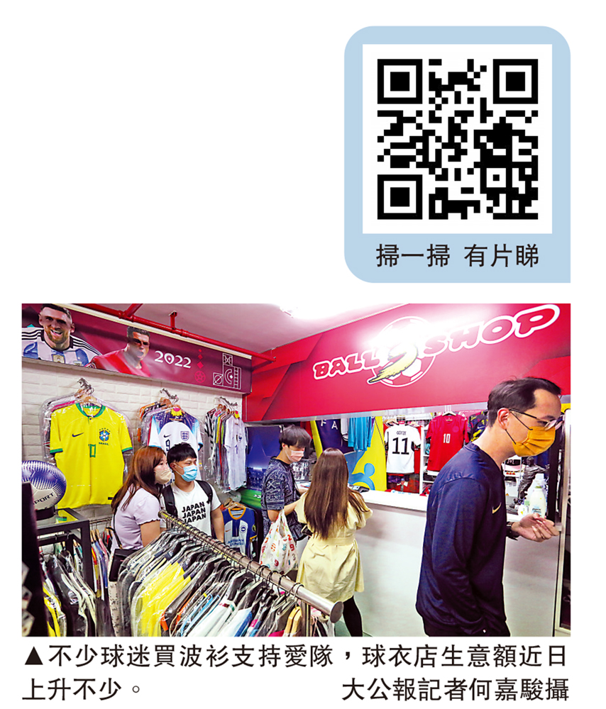 世界盃今晚開鑼,除了在電視前高呼支持自己的球隊,當然少不了穿上「愛隊波衫」,贏波後心情都特別高漲。大公報記者昨日走訪旺角波鞋街一帶的多間球衣專賣店,老闆表示近日生意量急升。