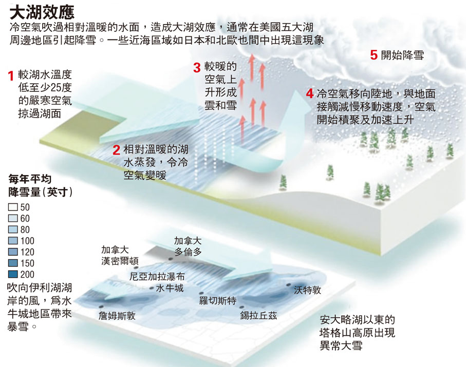今次暴風雪是由「大湖效應(Lake-Effect)」引發,是指寒冷空氣在掠過五大湖上空時,從較暖的湖面吸收水分,當帶有大量水分的冷空氣在湖岸減慢移動速度時持續積聚,因而降下大雪。