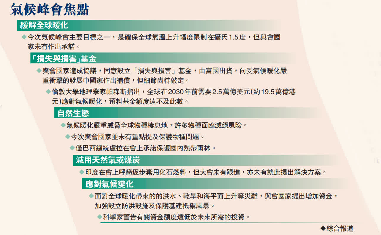 報道指出,有鑒於美方過去一直反對建立類似基金,COP27今次達成共識,意味着在這項多年來存在極大爭議的談判上取得重大突破。