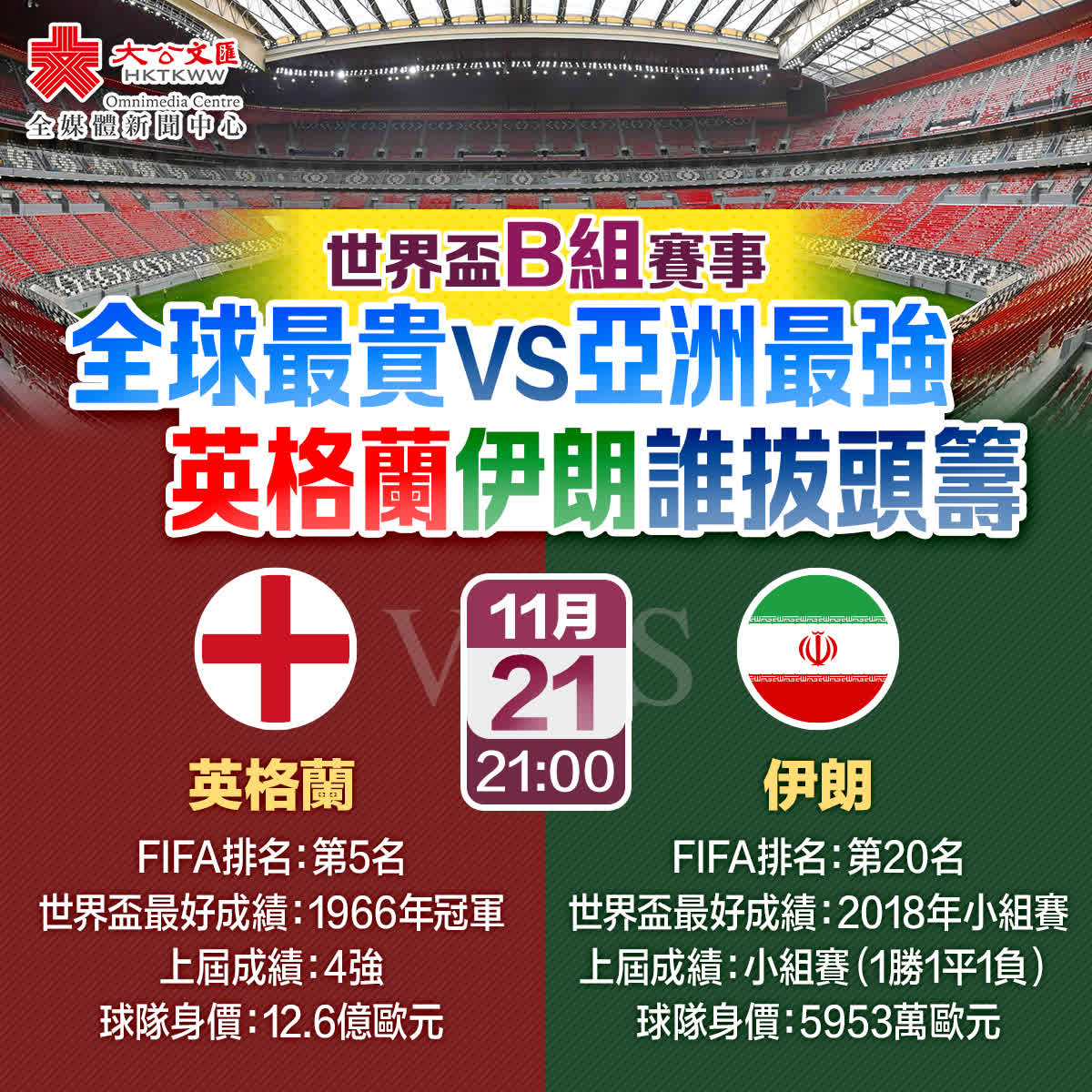 大公文匯全媒體報道,2022卡塔爾世界盃今(21日)晚9點開展B組首場對決,全球球隊身價最高、「三獅軍團」英格蘭對陣亞洲「一哥」伊朗隊。對於此戰,大部分人認為作為冠軍熱門之一的英格蘭隊應該能夠輕鬆取勝,但有意見認為伊朗隊也不是好啃的骨頭,英格蘭想取得勝利並非易事。