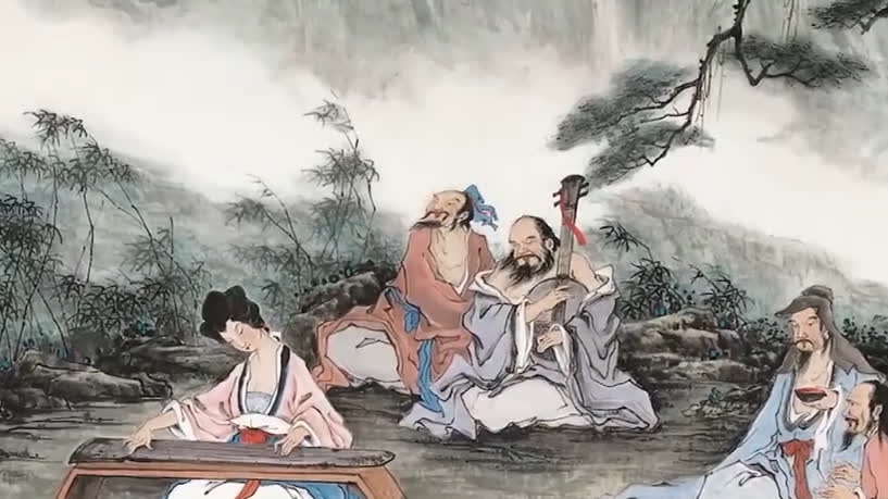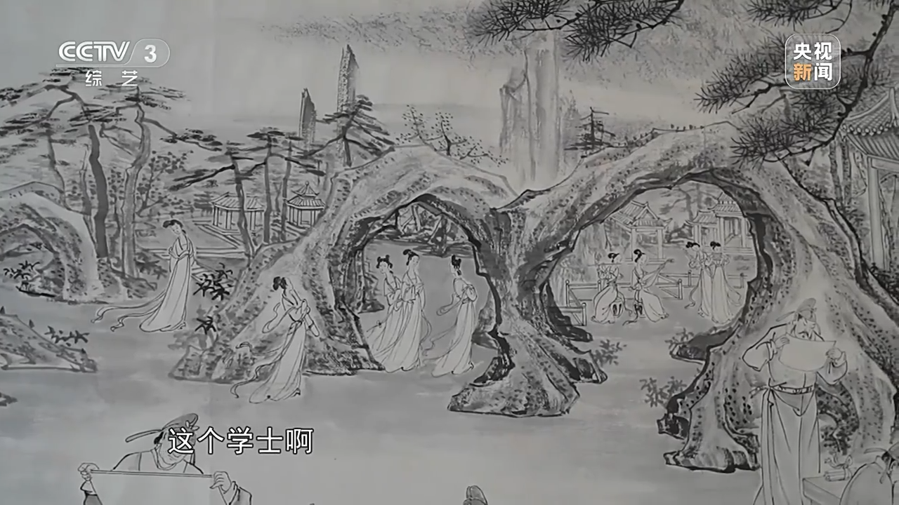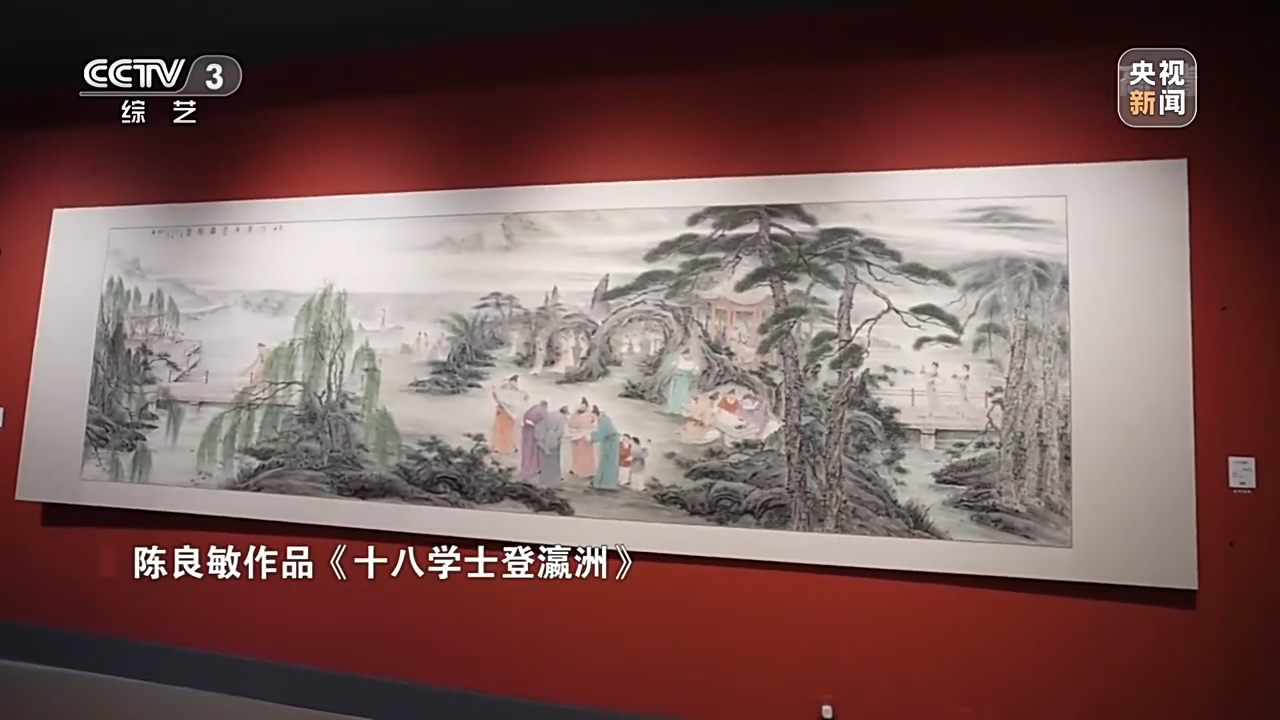 北京當代中國書畫研究會副會長 畫家 陳良敏:文化人,因此我這裏面就有比較突出他們的中國的琴棋書畫,這是在寫書法,這兩個他們在下棋,這個他們就在看畫,然後那邊一個就在彈琴,亭子裏面那個在彈琴,把這幾個主要的老百姓喜聞樂見,普遍認可的給描繪出來,組成一個畫面。我畫《十八學士登瀛洲》以古喻今,以唐代的盛世來比喻現在中華的太平盛世。