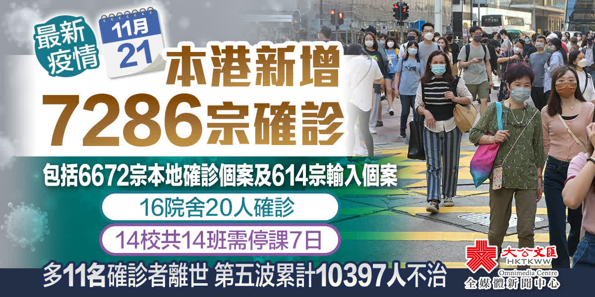 大公文匯全媒體報道,香港第五波疫情持續,衞生署衞生防護中心公布,截至今日(21日)零時,香港過去一日新增7286宗確診個案,包括6672宗本地確診個案及614宗輸入個案。本地確診個案中,核酸檢測陽性個案有1384宗,快測陽性個案5288宗。