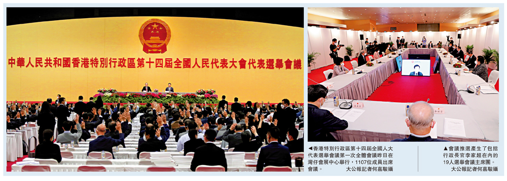 (大公報 記者 龔學鳴)香港特別行政區第十四屆全國人大代表選舉會議第一次全體會議昨日在灣仔會展中心舉行,選舉會議成員1107位成員出席了會議。會議推選產生了包括行政長官李家超在內的19人選舉會議主席團,他其後並獲推選為主席團常務主席。
