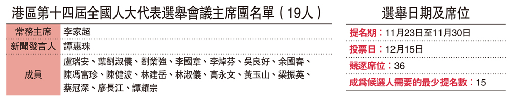 隨後,香港特別行政區第十四屆全國人大代表選舉會議主席團舉行第一次會議。會議一致推選李家超為主席團常務主席。主席團確定:2022年11月23日至11月30日為候選人提名時間;2022年12月15日上午舉行選舉會議第二次全體會議,投票選舉香港特別行政區第十四屆全國人大代表。主席團還確定譚惠珠為主席團新聞發言人。會後並發布了主席團第一號公告。