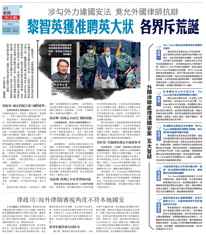 不過,上訴庭認為,未見到案件會涉及國家機密,即使審訊有機會涉及機密資料,亦無正當理由懷疑Tim Owen會違反《香港國安法》第63條的保密原則,而且Tim Owen亦受到當地的行為守則約束,不見得他離港後會違反守則。法庭亦未能信服批准Tim Owen來港代表黎智英,會損害《香港國安法》的立法目的。