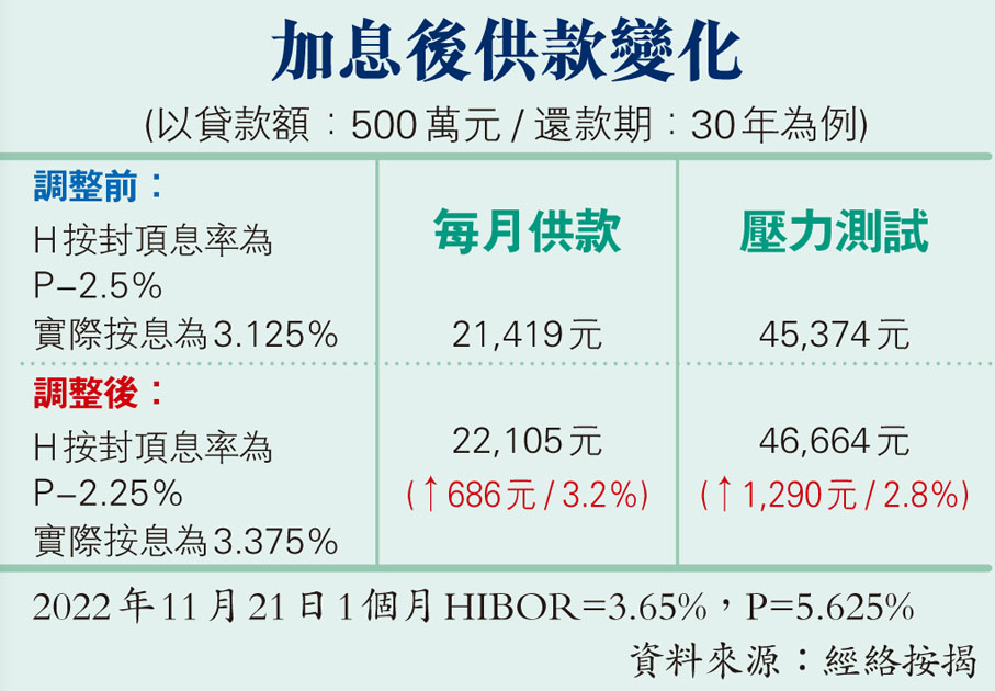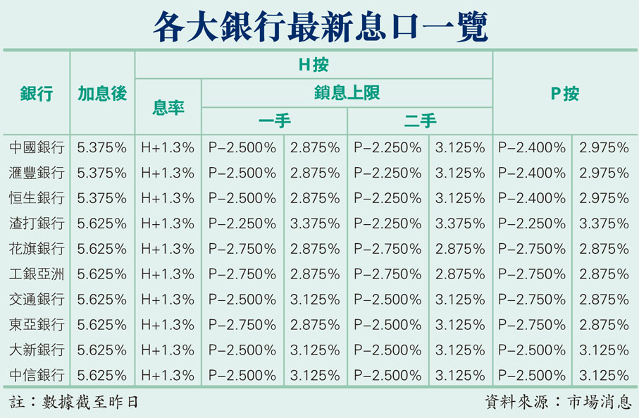 (香港文匯報記者 黎梓田)社會掀加風,昨日中電及天星小輪表示申請加價,連銀行都宣布加按息。渣打上調新造H按封頂息0.25厘,實際按息由原本3.125厘加至3.375厘,新造H按借500萬元貸款,每月供款對比加息前增加686元,加幅達3.2%。業界指出,今次再有大型銀行上調H按鎖息上限,將開啟新一波加按息潮,同時預料港銀下月將隨美聯儲加息再度上調最優惠利率(P),幅度約0.25厘,令供樓人士百上加斤,在經濟放緩下樓價亦恐進一步受壓。