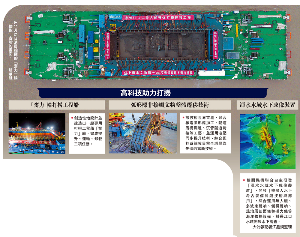 據國家文物局介紹,「長江口二號」古船打撈過程中採取了世界首創的「弧形樑非接觸文物整體遷移技術」。該技術融合了核電弧形樑加工、隧道盾構掘進、沉管隧道對接等工藝,並運用液壓同步提升技術、綜合監控系統等全球最先進的高新技術,將這艘150餘年前的古船「抱」出水面,是科技創新賦能水下考古的重要實例,為國際水下文化遺產保護提供了中國案例、中國模式、中國經驗。