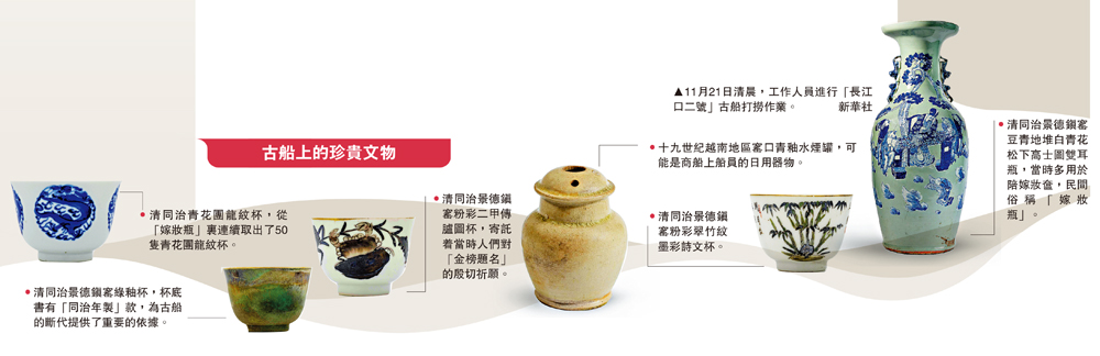 通過選取4個艙室進行的小範圍清理,艙內均發現有碼放整齊的景德鎮窰瓷器等精美文物,已經出水完整或可修復的文物種類多、數量大。另外,在船體及周圍還出水了紫砂器、越南產水煙罐、木質水桶殘件、桅杆、大型船材、鐵錨、棕纜繩、滑輪以及建築材料等大量文物。特別是出水的綠釉杯底書有「同治年製」款,為古船的斷代提供了重要的依據。2021年和2022年,上海市文物局兩次組織水下考古專業機構對「長江口二號」古船及周圍進行了水下調查,清理出了前幾次調查未發現的元代瓷器和高60厘米完整的豆青釉青花大瓶等大型整器,以及一批產自江蘇宜興窰陶瓷器。