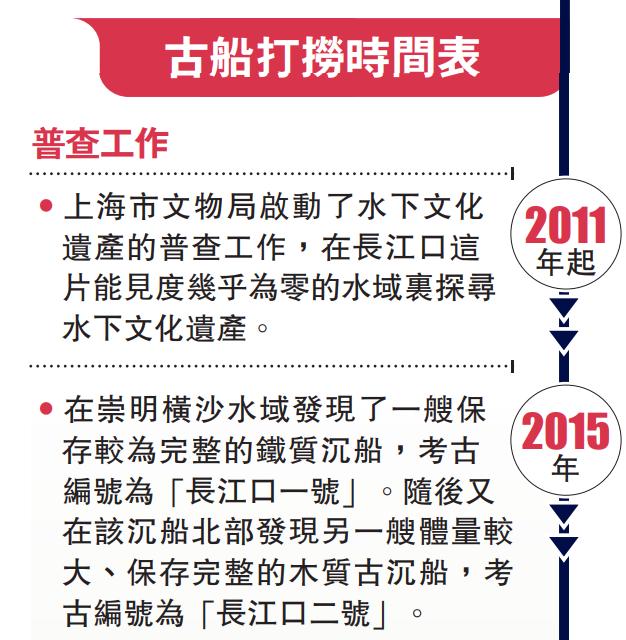 2015年,長江口崇明橫沙水域,一艘木質古船通過聲吶掃測等技術被發現,考古編號為「長江口二號」。經過7年的水下考古調查勘探,探明了「長江口二號」古船的基本情況。「長江口二號」古船為木質帆船,確認年代為清代同治時期(公元1862-1875年),所在水域水深8-10米,船體埋藏於5.5米深淤泥中,殘長約38.1米、寬約9.9米,已探明有31個艙室。古船上部的船艏、纜樁、主桅杆、左右舷等結構完整,從目前的勘測情況看,推測為清代上海廣為使用的沙船的可能性最大。