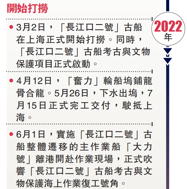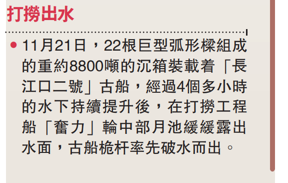 (大公報 記者 江鑫嫻)21日凌晨,長江口橫沙水域見證了中國水下考古新的歷史性突破。22根巨型弧形樑組成的沉箱裝載着「長江口二號」古船,經過近4個多小時水下持續提升後,在打撈工程船「奮力」輪中部月池緩緩露出水面。這是這艘清代同治年間的古船時隔150多年重新出現在世人眼前。據悉,「長江口二號」古船發現於2015年,是目前國內乃至世界上發現的體量最大、保存最為完整、船載文物豐富的古代木質沉船之一,填補中國清代晚期大型木帆船研究空白。