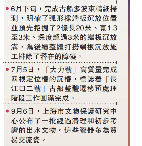 幾天後,「長江口二號」古船將被「奮力」輪帶入楊浦上海船廠舊址1號船塢,開啟文物保護與考古發掘新階段。文物考古工作人員將根據古船考古和文物保護方案,圍繞古船遺址形成過程、建造技術、航線等課題展開全方位研究,最大限度地發掘古船的科學、歷史、藝術、社會和文化價值。