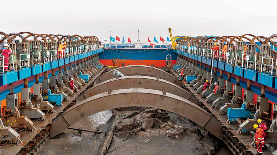 打撈裝置的弧形樑的直徑為19米,一根弧形樑重達70噸,發射架重達150噸,對加工的技術精度要求極高。按照設計要求,海上作業時,發射架要將弧形樑從它內部頂進河床。這對發射架和弧形樑的同心度要求極高,精度要求必須達到0.5毫米,如果達不到精度要求,弧形樑就會在發射架內被「卡死」,無法順利頂進作業。