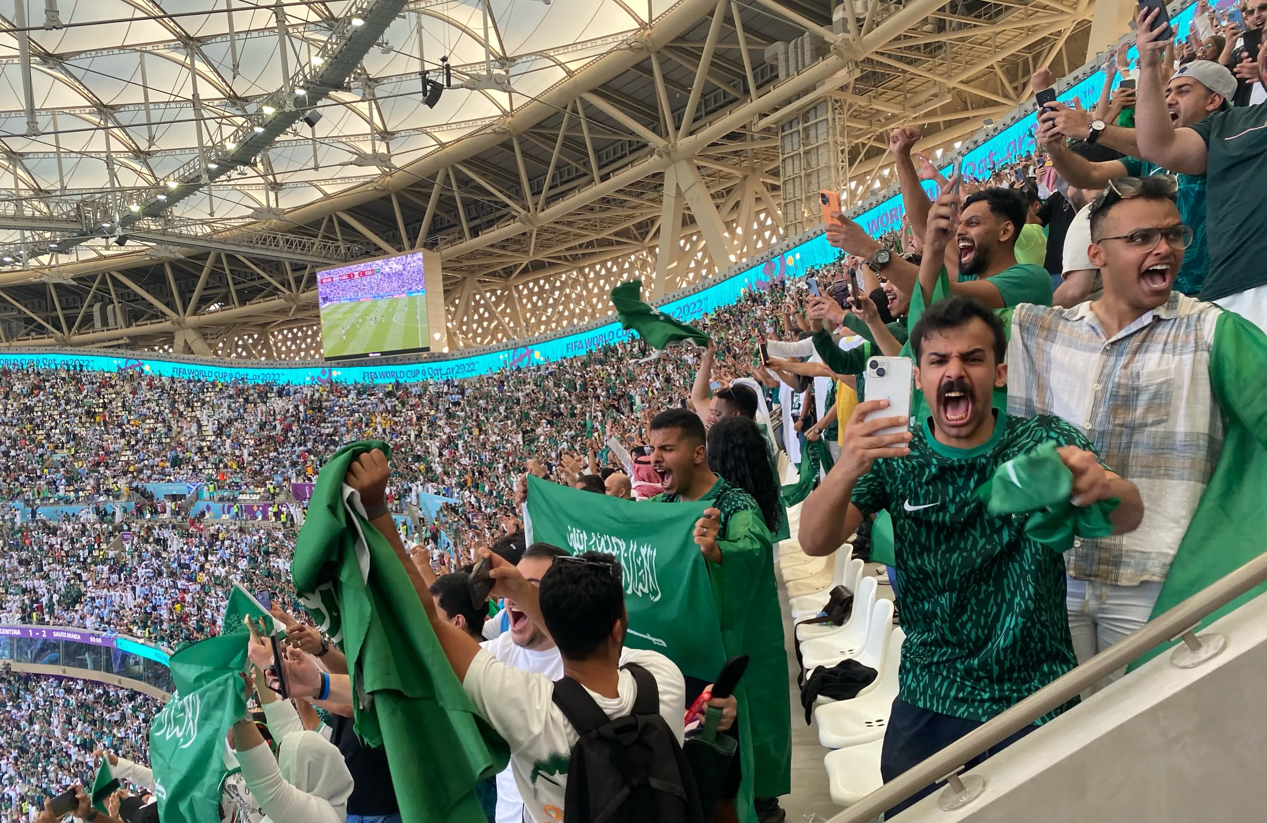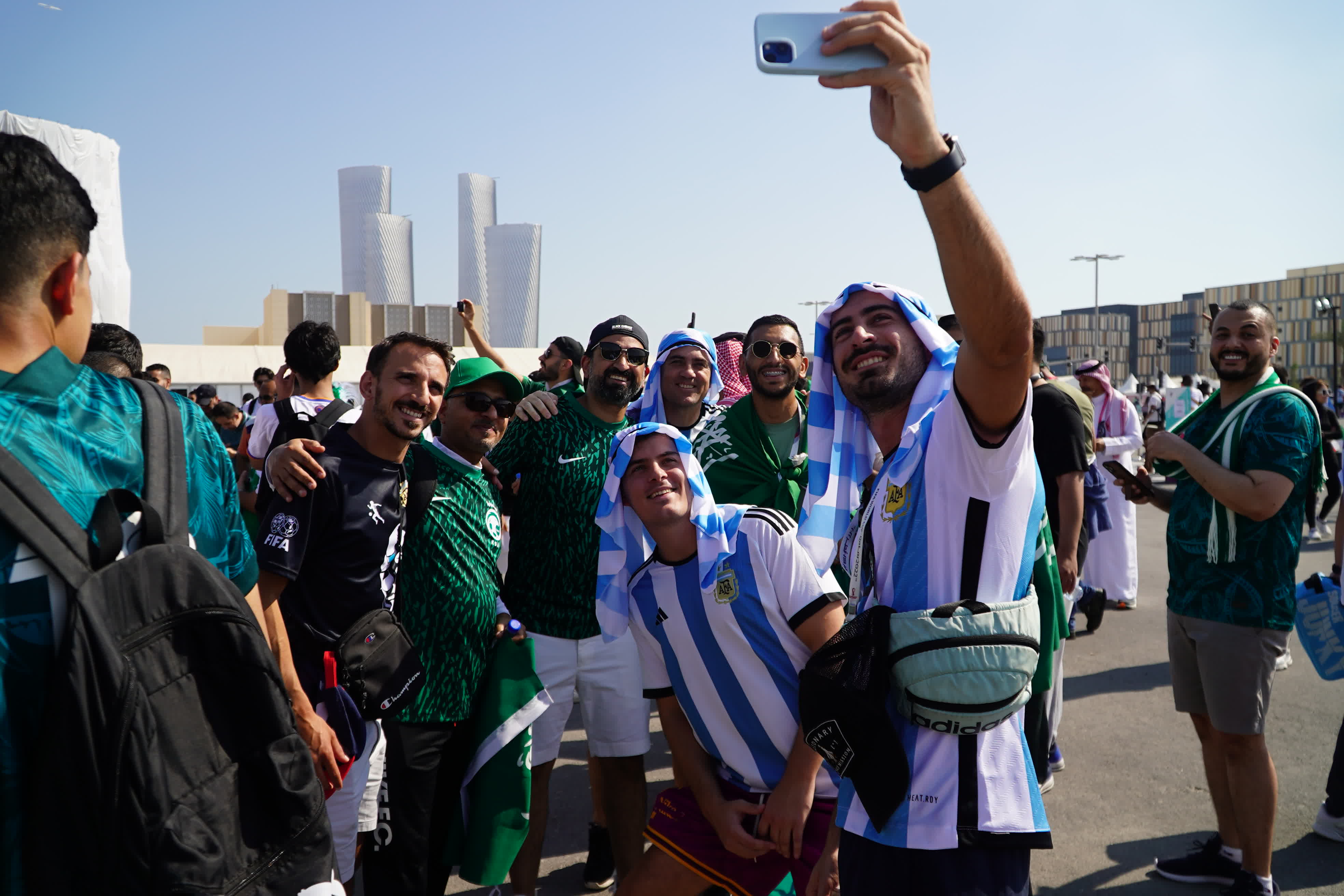 (大公文匯網記者 郭正謙 世界盃直擊)世界盃除了是一眾球隊的比拚,亦是各國球迷之間的較量,首次採訪世界盃的小記終於體驗到甚麼是真正的「第12人」,開賽前還能無分你我地開心自拍,哨子聲一響起便是對敵方的各種噓聲和嘲諷,坐在沙地球迷旁邊記者席的小記感受至深,雖然場面上阿根廷球迷數量佔絕對優勢,不過沙地球迷的聲量卻絕不遜色,尤其是完場前補時階段,投訴球証遲遲未鳴哨完場的謾罵聲此起彼落,保証不懂阿拉伯髒話也能體會到他們有多激動。