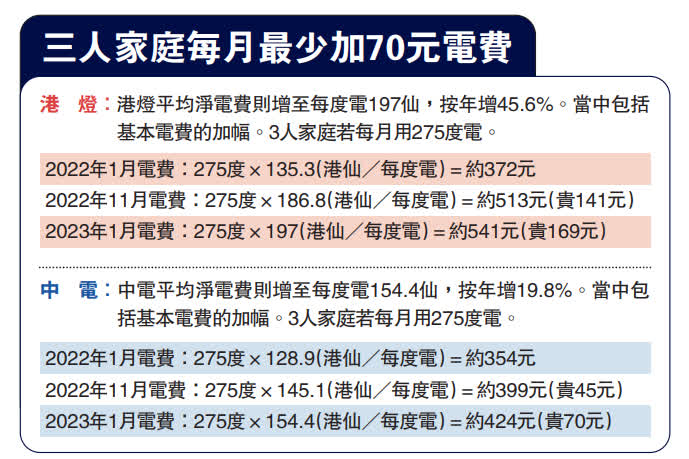 由明年元旦起,中電電費較今年11月加價6.4%,但對比今年1月,累計加價19.8%;港燈電費較今年11月加價5.5%,但對比今年1月,累計加價45.6%。
