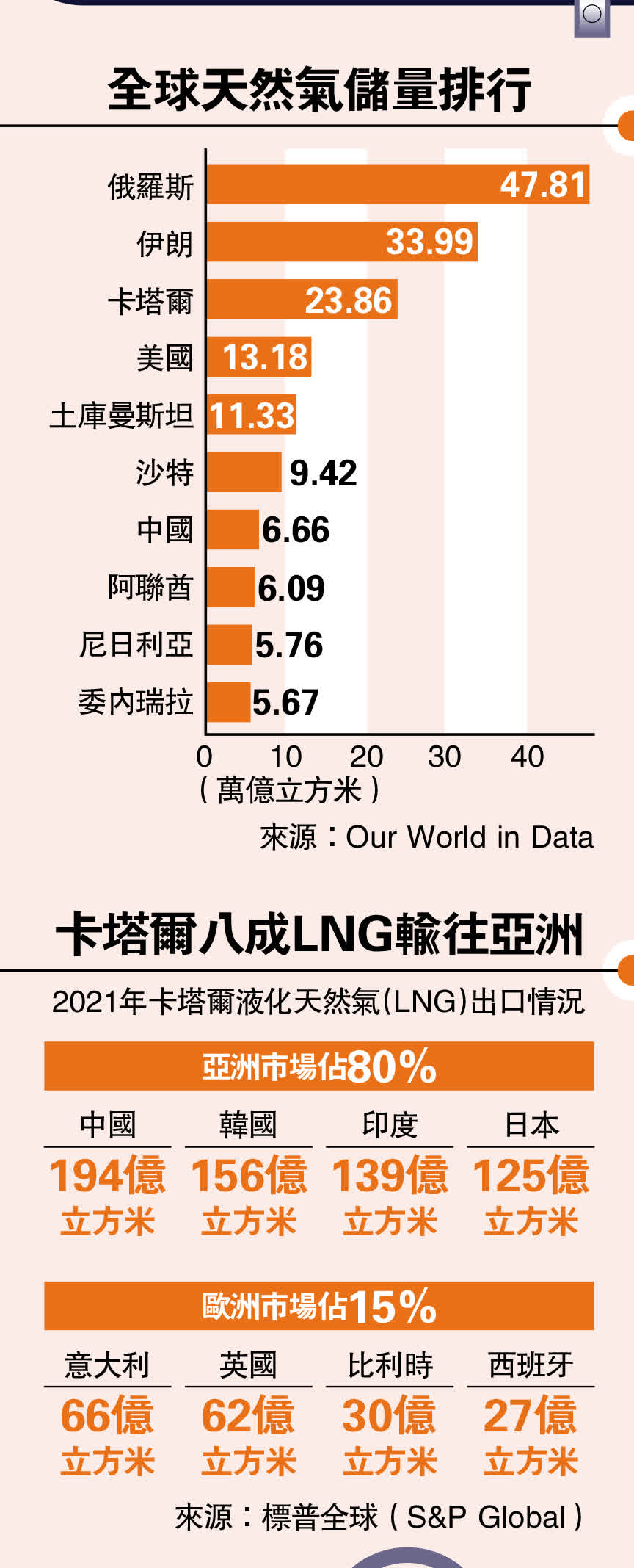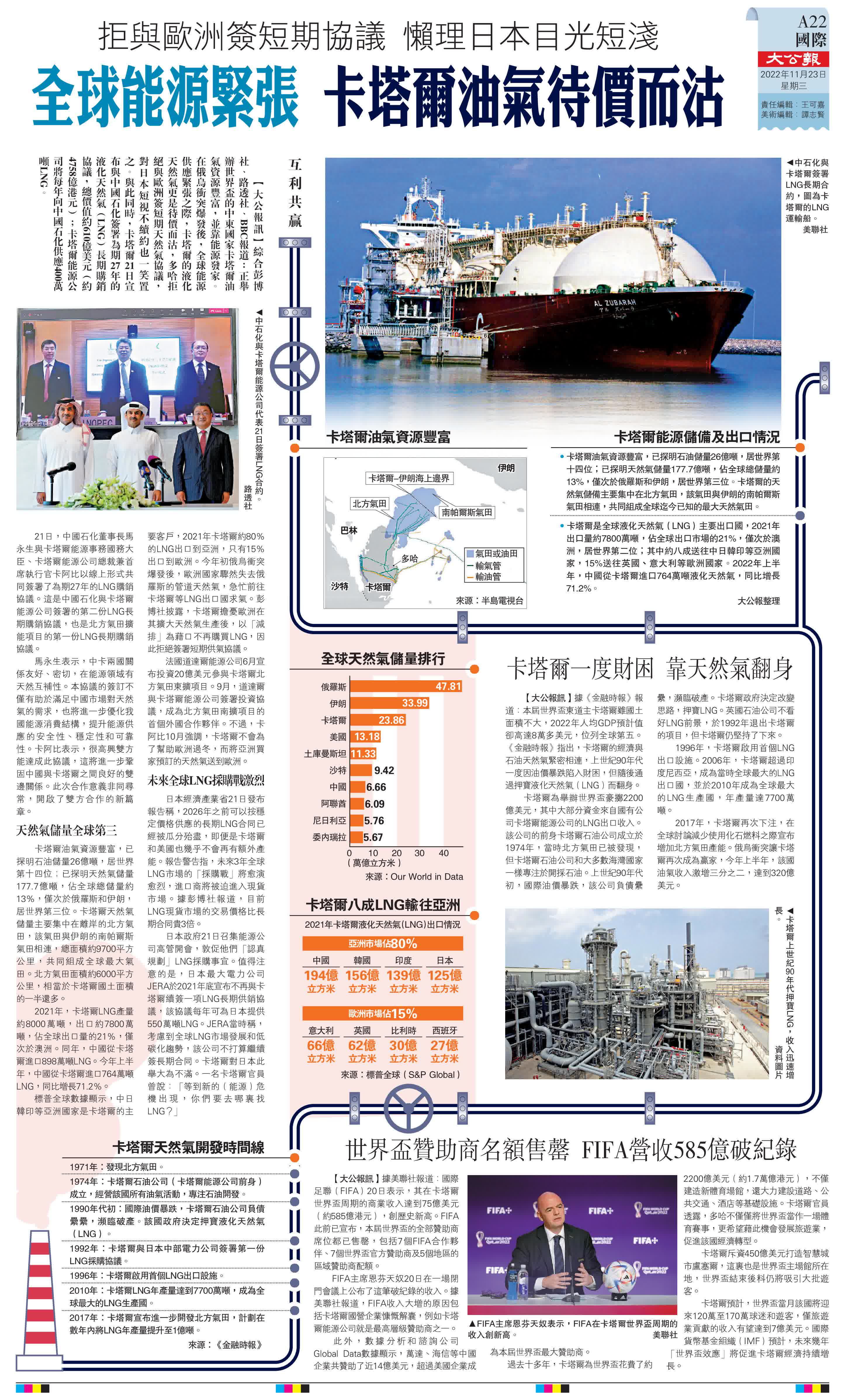 大公報綜合彭博社、路透社、BBC報道,正舉辦世界盃的中東國家卡塔爾油氣資源豐富,並靠能源發家。在俄烏衝突爆發後,全球能源供應緊張之際,卡塔爾的液化天然氣更是待價而沽,多哈拒絕與歐洲簽短期天然氣協議,對日本短視不續約也一笑置之。與此同時,卡塔爾21日宣布與中國石化簽署為期27年的液化天然氣(LNG)長期購銷協議,總價值約610億美元(約4758億港元);卡塔爾能源公司將每年向中國石化供應400萬噸LNG。