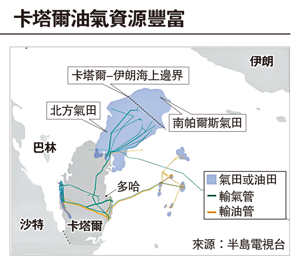 •卡塔爾油氣資源豐富,已探明石油儲量26億噸,居世界第十四位;已探明天然氣儲量177.7億噸,佔全球總儲量約13%,僅次於俄羅斯和伊朗,居世界第三位。卡塔爾的天然氣儲備主要集中在北方氣田,該氣田與伊朗的南帕爾斯氣田相連,共同組成全球迄今已知的最大天然氣田。