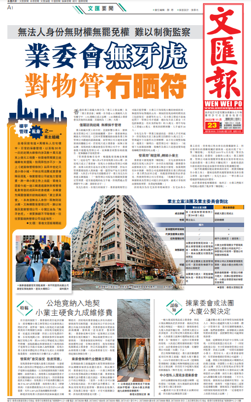 (文/圖:香港文匯報專題組)全港目前有逾4萬幢私人住宅樓宇,日常的保養管理,以至每30年一次的定期大維修均涉及數十萬元甚至上億元工程費,但香港兩類業主組織雖有其優點,但局限性亦不少,加上《建築物管理條例》沿用半世紀只是小修小補,不時出現法團或業委會賬目混亂,物業管理公司被拖欠管理費,將一眾小業主告上法庭。香港文匯報今起一連三輯通過案例拆解管理亂象背後的成因和改善建議,本輯會先揭露僅屬於諮詢組織的「業主委員會」,本身並無法人身份,既無財政大權、又無權罷免管理公司,難以制衡及監察管理公司,令業主淪為「無牙老虎」,若要推翻不平等條款,往往要籌錢與管理公司法庭相見。